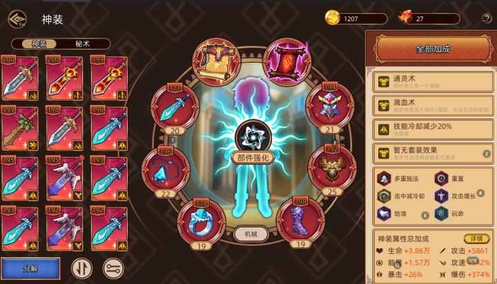 继上文奇遇:打副本中途可以碰到的属性商人,推荐购买,低廉价格即可获得属性。 宠物:神话宠物推荐携带暴脾气,君子剑(优先级最高且只要一只即可) ,狮灯。其他好用的宠物有胖虎(加生命且可以持续回血),僵小跳(额外复活一次),回甘壶(每层可获得一层圣盾), 神装:就是装备,点开有分装备和秘术两种,装备穿戴主要通用模板为左边固定冷却套,右边即为爆伤散件,左边羁绊>词条>等级,右边词条>等级,这时候就