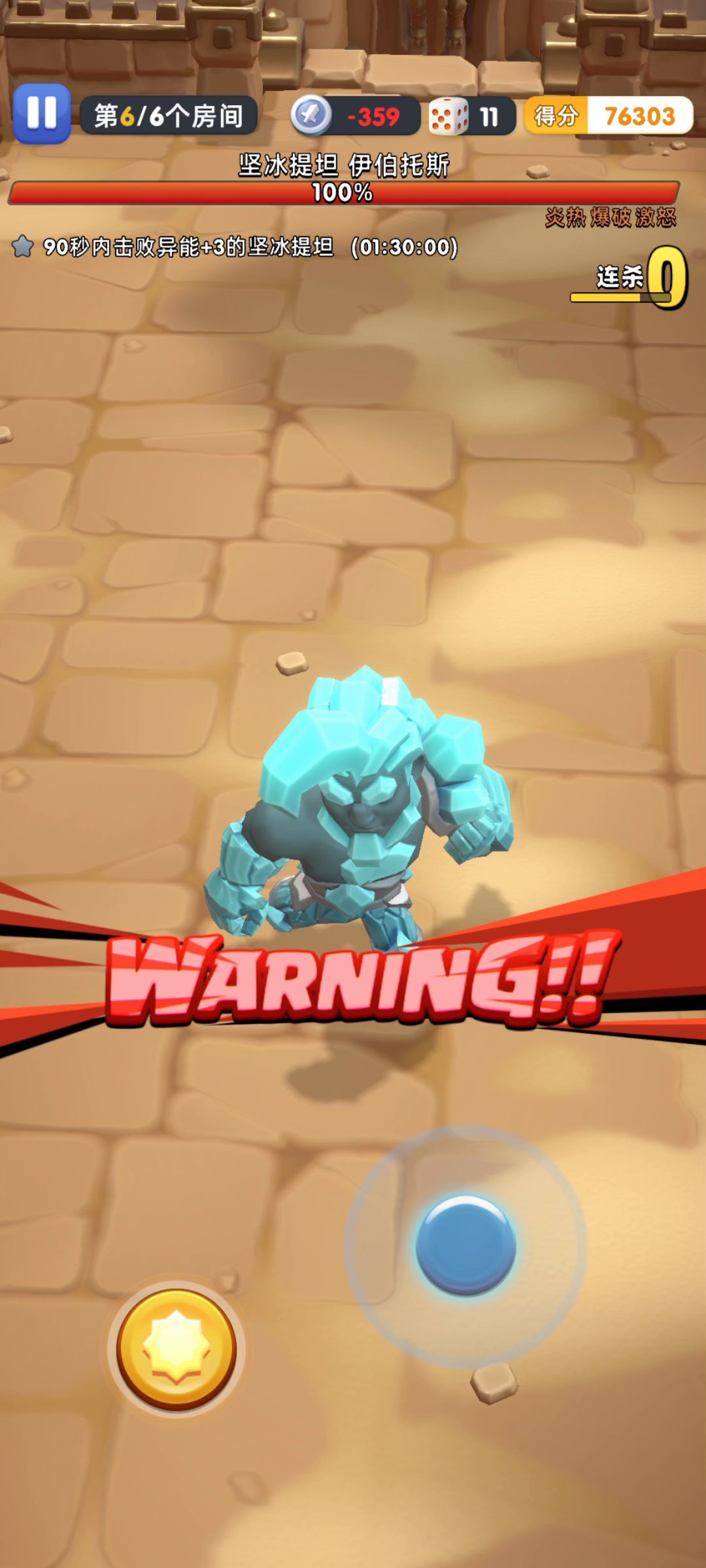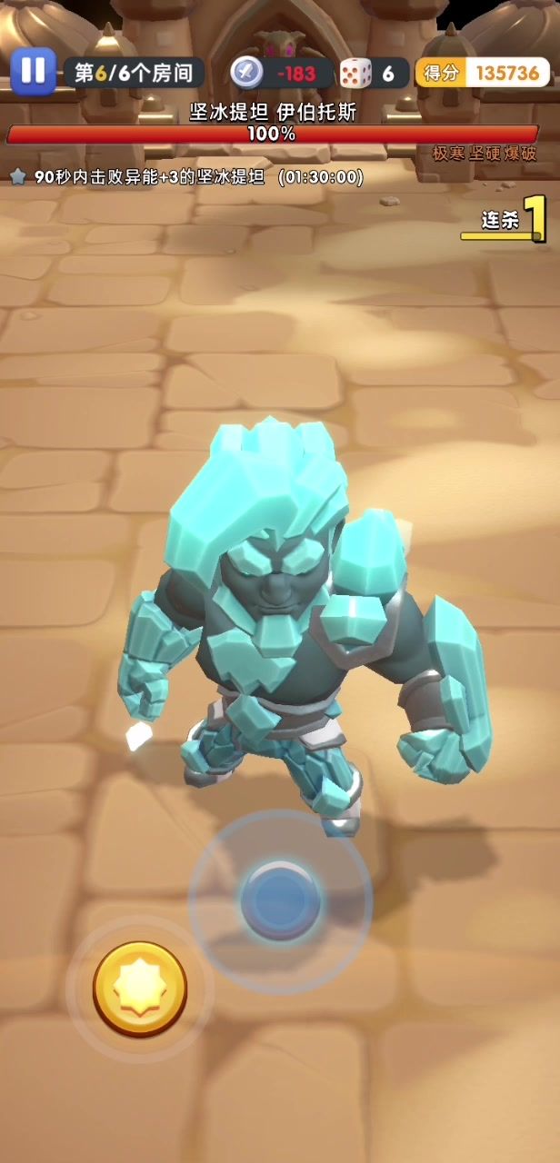 冰蛇一共就两个技能,放冰柱(冰柱会在放两次冰锥后消失)追着人物滚动 打冰蛇时,尽量用火陀螺打断他放冰柱,如果没能打断,那就尽量把冰柱控制在一个半场内,等他滚动时跑去另一个半场躲避。 难度评级A