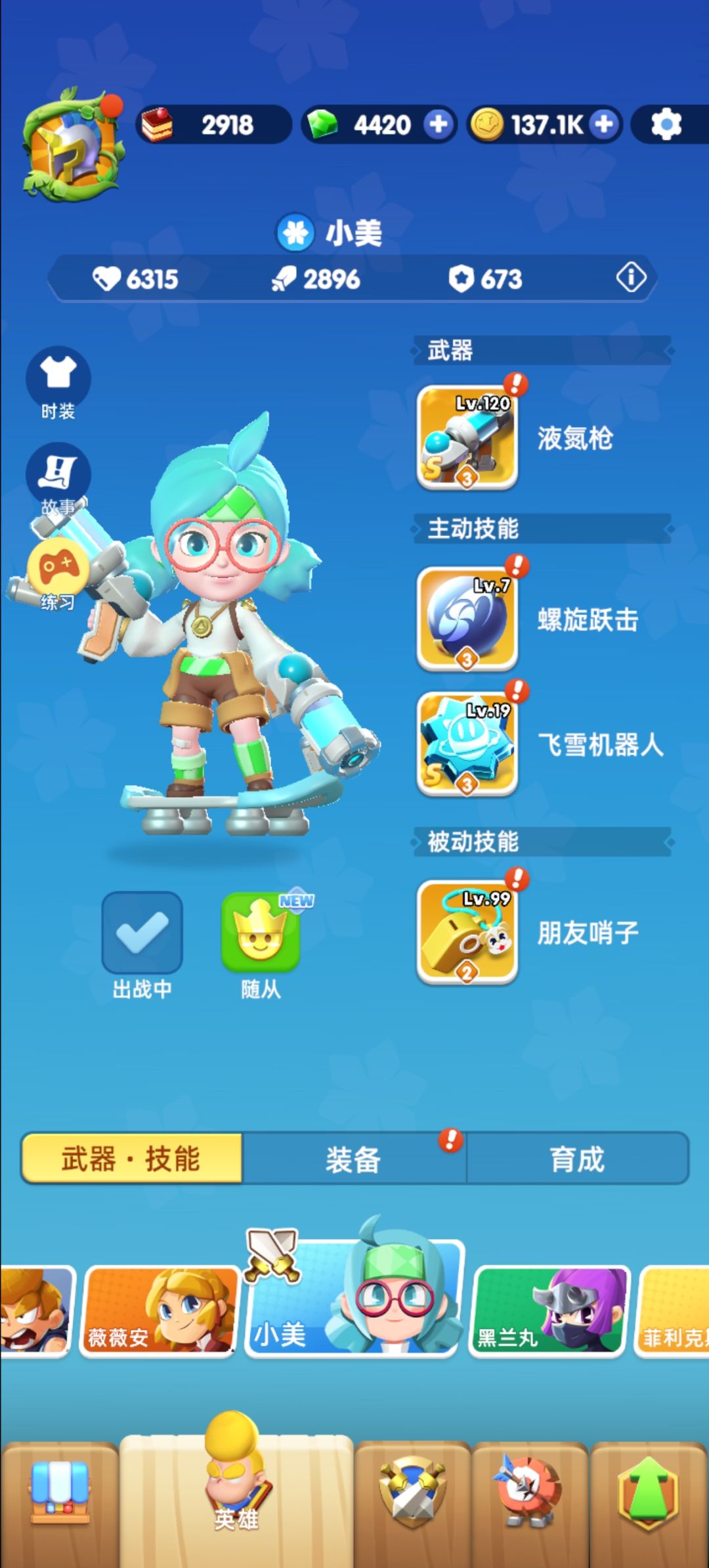 在没有其余角色的情况下可以选择七日活动送的薇薇安 装备选择绿叶套装与极地套装(可以在黄金集市里购买)武器选择冰弩,必杀技选择喷雪机器人,被动选择哨子,战技的话可以看个人喜好选择(我是由于当时看中他杀怪可以刷新才合成。经过实测,攻击力不够的话还是很难刷新,橙色性价比不高) 装备那一栏,绿叶套装和极地套装可以和冰弩 喷雪机器人相配合,在打boos时注意点血量可以直接站撸 游戏中技能选择: 1.冰雾戒指