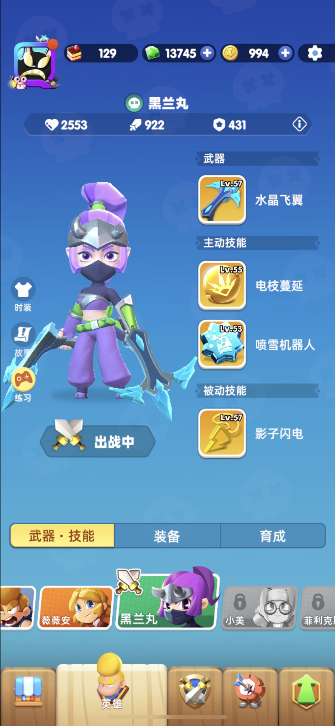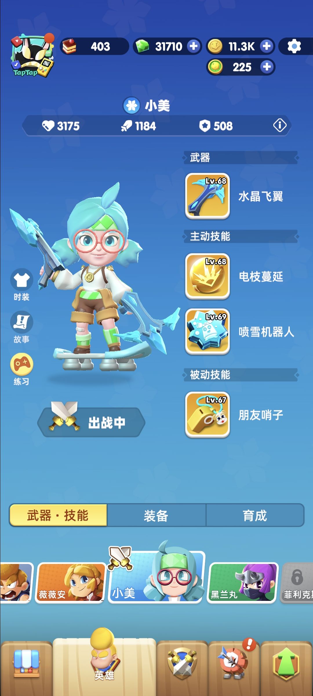 首先这款游戏《骑士冲呀》不管是零氪党,6元党,微氪都是可以玩的,只要有足够的耐心通关养老还是可以做到的,虽然我还没有通关,不过也快了。 图一是我常用武器技能。忍者首推武器:水晶飞翼(冰驽)冰属性伤害,附加减速,自带加攻速,现版本最强势武器,远程攻击更能保证生存问题。战技:螺旋跃击,高爆发且带控制,配合忍者加伤害的天赋能打出超高伤害,氪佬更是能打出百万级的伤害。必杀技:高压沙炮蚤,合成到橙色级别时能