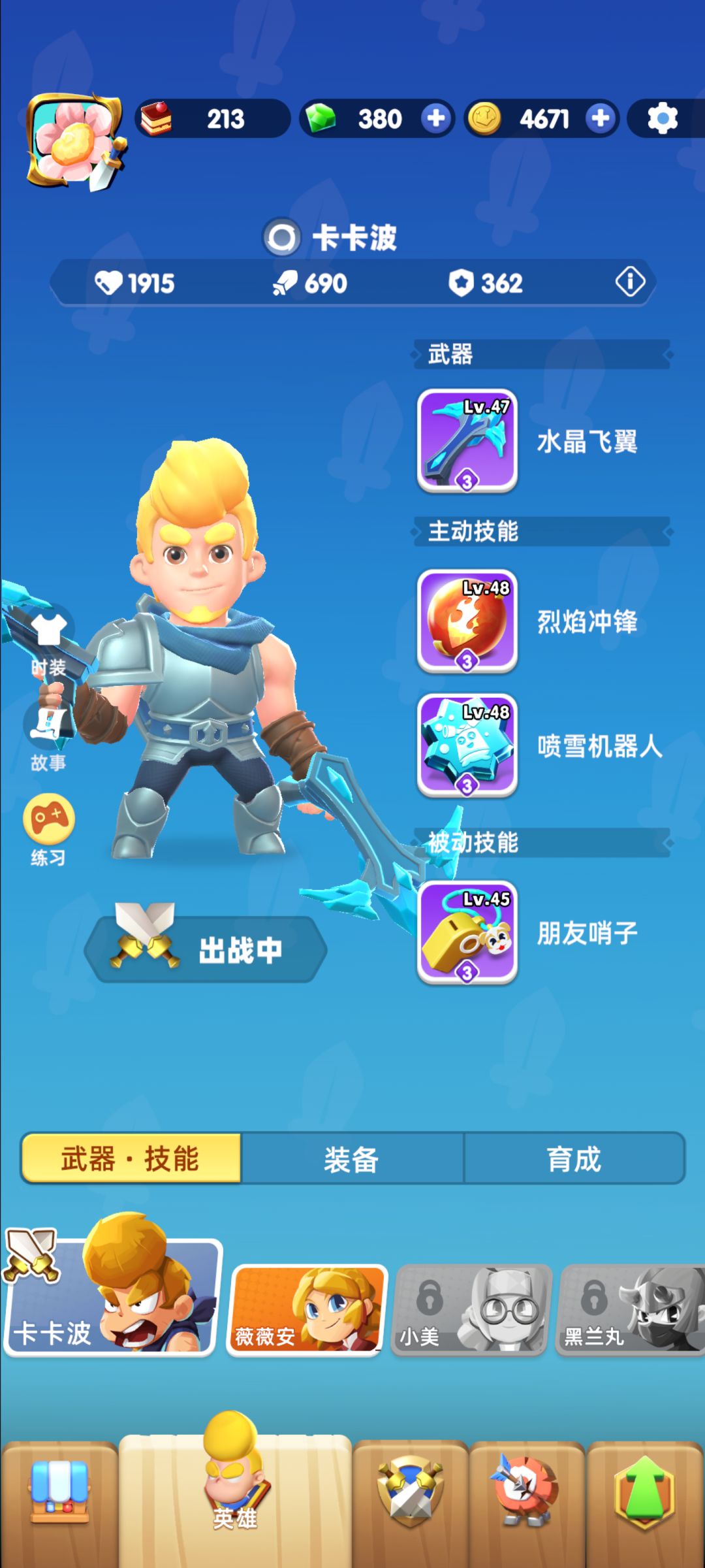 冰系套装: 人物用签到送的射手就可以,加攻速(我都给乌兰丸升级了,就没换)后期可以换小美,可以移动攻击,妈妈再也不用怕我被boss碾的无法攻击了。 武器用冰弩,主打一个攻速快,叠恶寒还能暴击。 技能用冰枪,可以叠恶寒继续暴击,(冰枪没紫捂脸哭[表情_捂脸哭]只能用螺旋丸) 必杀技用冰雪机器人,可以挡伤害,还能数量越多打得越疼。 被动用遥控按钮,加速战极,地雷还能按恶寒层数增伤。金色还能自动飞最远敌