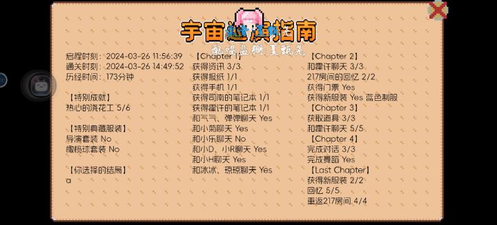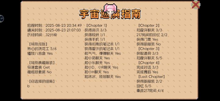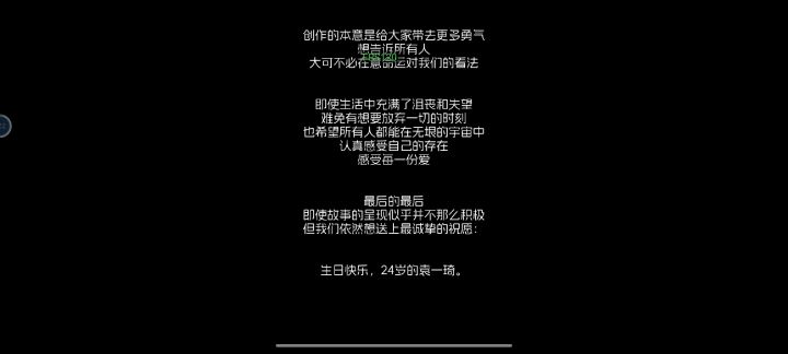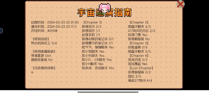 这个游戏刷了四遍才全部完美通关 第一次玩的时候还被霍许和司南的结局刀到了🥺而且能看的出来作者大大及工作室的大家的用心了 比如很多的一些小细节真的很能戳到我!具体是哪些就由弹弹们自行发掘啦哈哈还有就是琦琦的一些对话语气真的很像她本人能说出来 作者大大这是吃了几个琦琦才做出来的呀 绝对是超级真爱粉了总结:这个游戏对于本弹弹来说算得上是一个优质游戏 弹弹们仔细观察就能过了呦 最后 祝琦琦和弹弹及