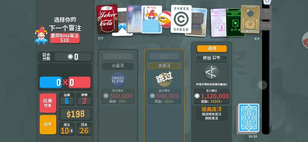 朋友们,这个游戏太小众了,只好来小丑牌求攻略。 小丑牌分数最高的玩法是钢K流吗,我复刻了一下确实猛,但是面对BOSS“贵族牌失效”的限制时却束手无策。 请问有什么办法打的更高层吗?#小丑牌 #小丑牌balatro #小丑牌攻略