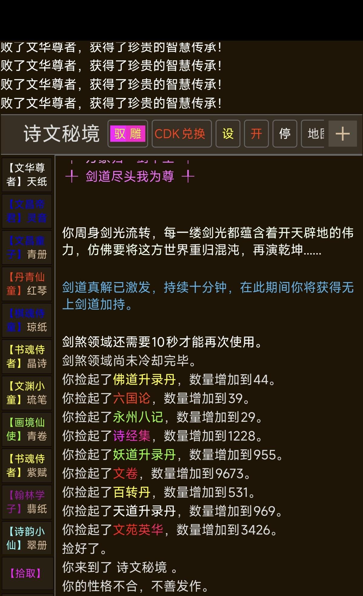 一、地图介绍: 泱泱华夏,诗词如璀璨星河,凝聚着华夏之魂,在这里充满无数奇珍异宝,等待着有缘人诗仙秘境可通过 驭雕-诗仙秘境 到达到达后周边是没有怪的,可以通过指令快速前往有怪的房间,指令为:walk 诗文秘境秘境里的怪为命魂+诗魂类型,每只怪随机掉落文气卷轴/词条强打石/天命轮盘,童子跟长老不会破长生,真君会破长生,怪的境界越强爆率也就越高珍贵仙品--文气卷轴:提高经验、潜能、诗文点