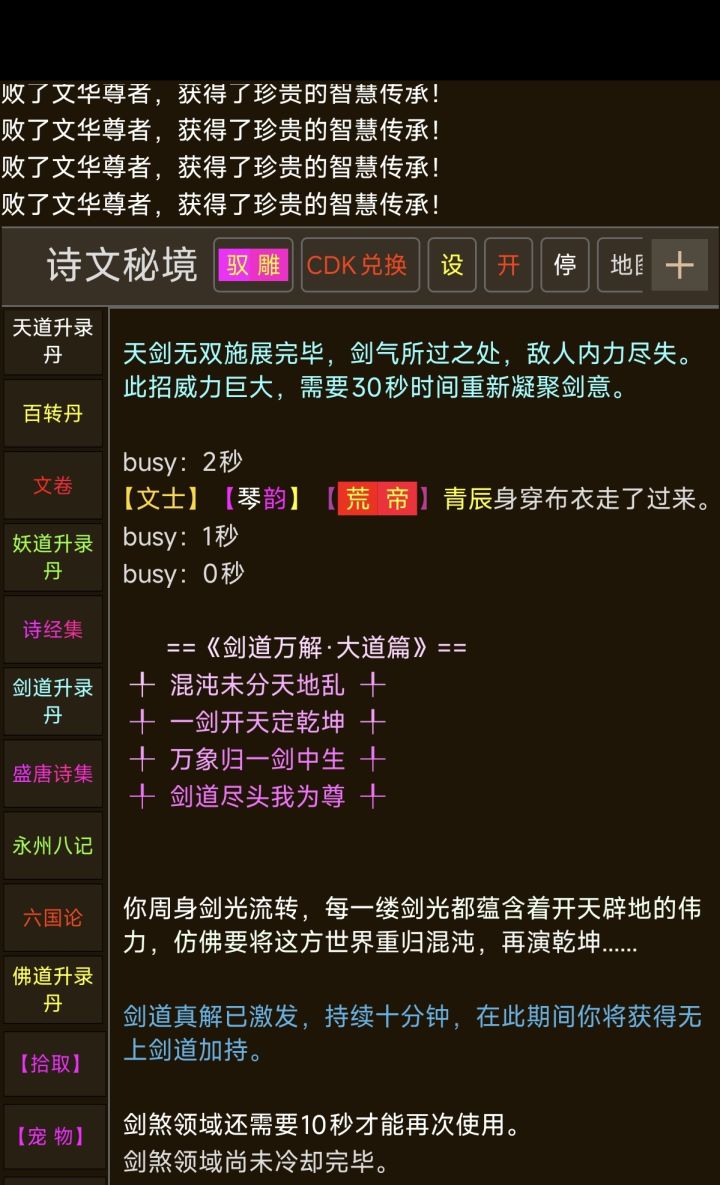 一、地图介绍: 泱泱华夏,诗词如璀璨星河,凝聚着华夏之魂,在这里充满无数奇珍异宝,等待着有缘人诗仙秘境可通过 驭雕-诗仙秘境 到达到达后周边是没有怪的,可以通过指令快速前往有怪的房间,指令为:walk 诗文秘境秘境里的怪为命魂+诗魂类型,每只怪随机掉落文气卷轴/词条强打石/天命轮盘,童子跟长老不会破长生,真君会破长生,怪的境界越强爆率也就越高珍贵仙品--文气卷轴:提高经验、潜能、诗文点