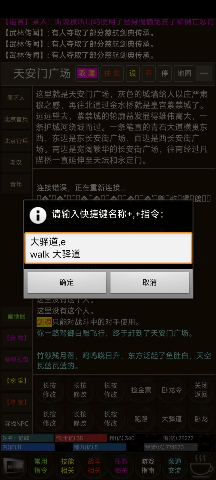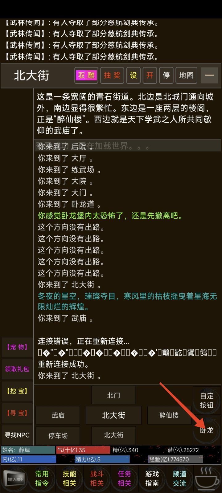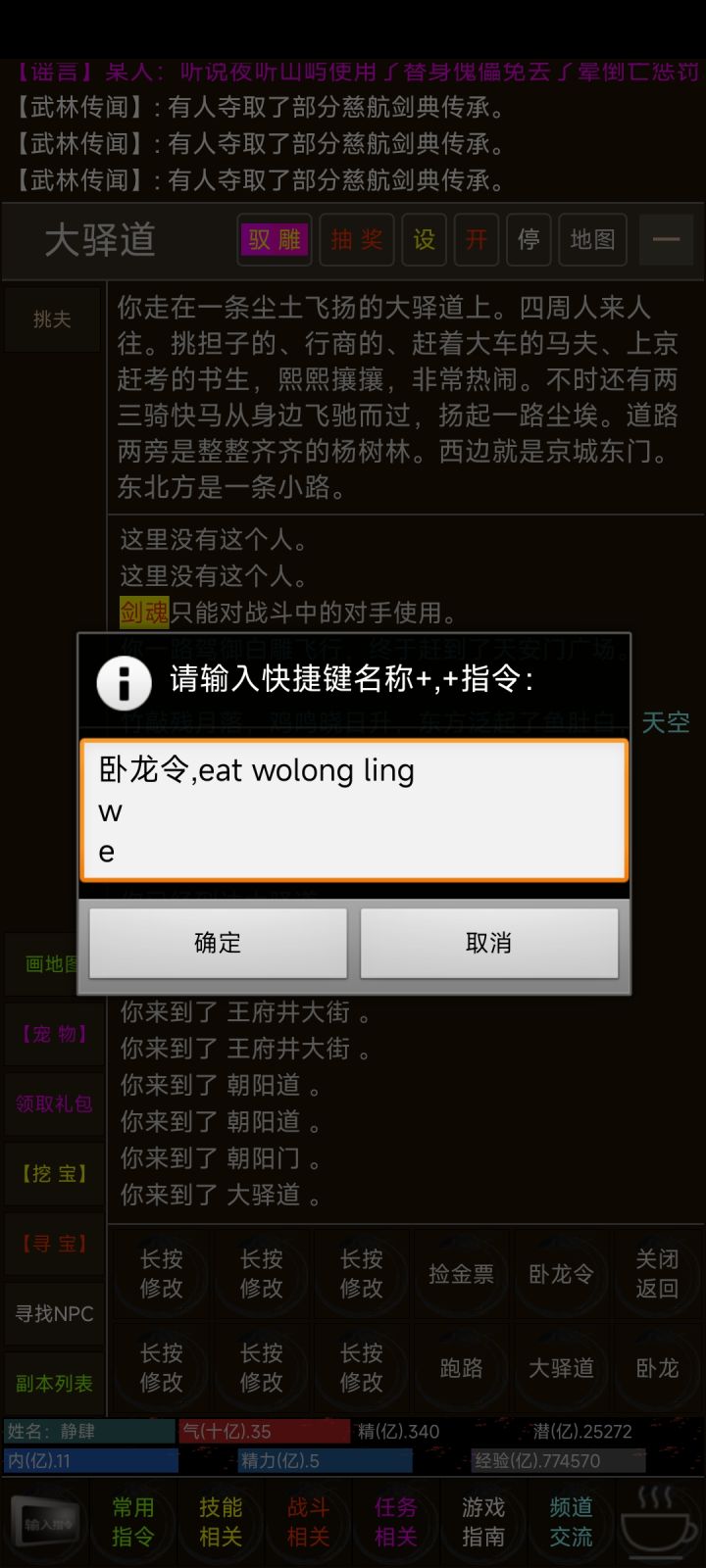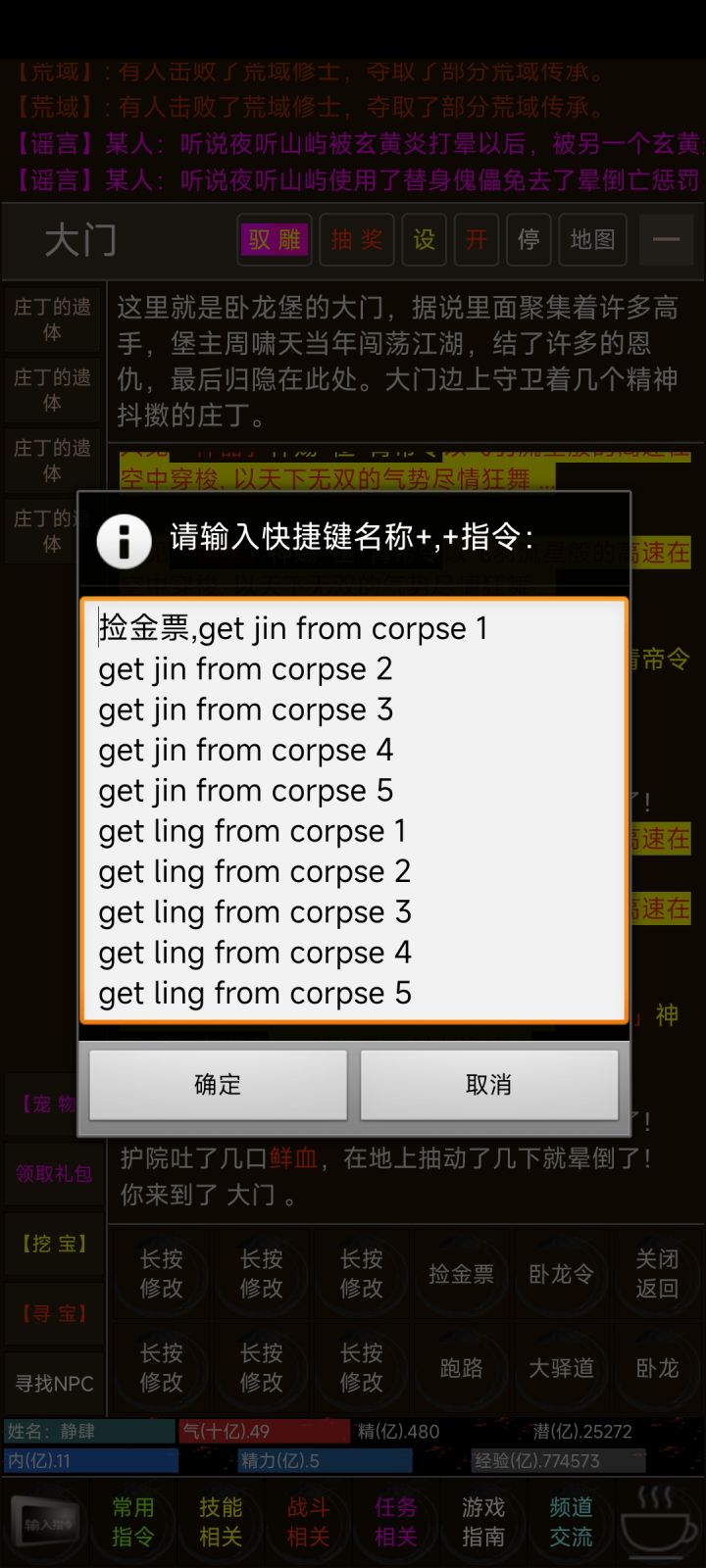 图一先把右下角的观察四周改成我们需要的代码,也就是图二(武学技能群攻有武道三千,及独孤九剑的剑魂这里我用的剑魂)点击会飞去广场,到了广场就用自定义按钮跑至卧龙副本处也就是用图三指令图四指令左右横跳能够刷新左下角的卧龙列表,图五找到自己ID副本图六到了副本里按右下角准备好的指令,按一次就会走一步,图七打完后用指令把金票及其灵卷捡起来,图八打完后用自定义按钮直接跑回北大街跑完后就到了图