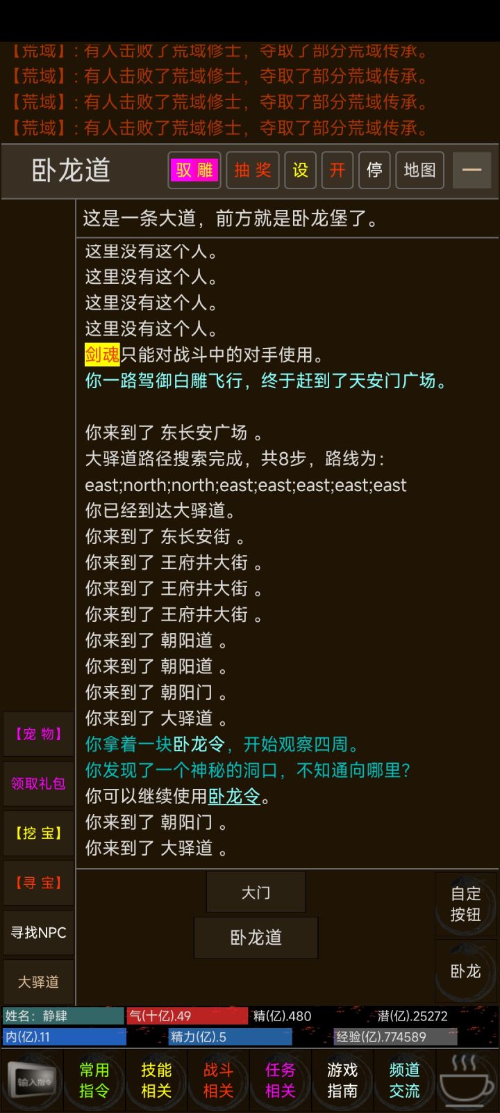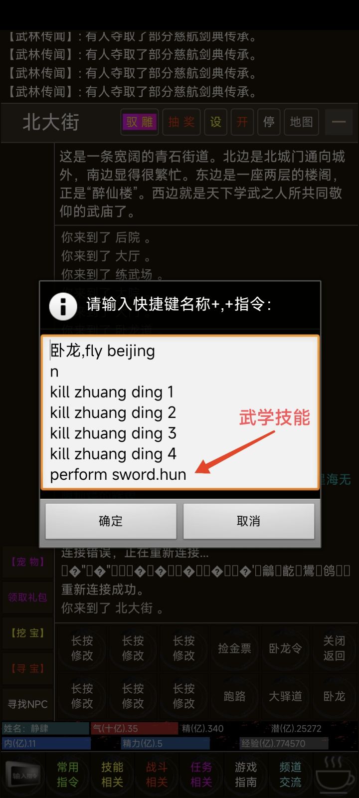图一先把右下角的观察四周改成我们需要的代码,也就是图二(武学技能群攻有武道三千,及独孤九剑的剑魂这里我用的剑魂)点击会飞去广场,到了广场就用自定义按钮跑至卧龙副本处也就是用图三指令图四指令左右横跳能够刷新左下角的卧龙列表,图五找到自己ID副本图六到了副本里按右下角准备好的指令,按一次就会走一步,图七打完后用指令把金票及其灵卷捡起来,图八打完后用自定义按钮直接跑回北大街跑完后就到了图