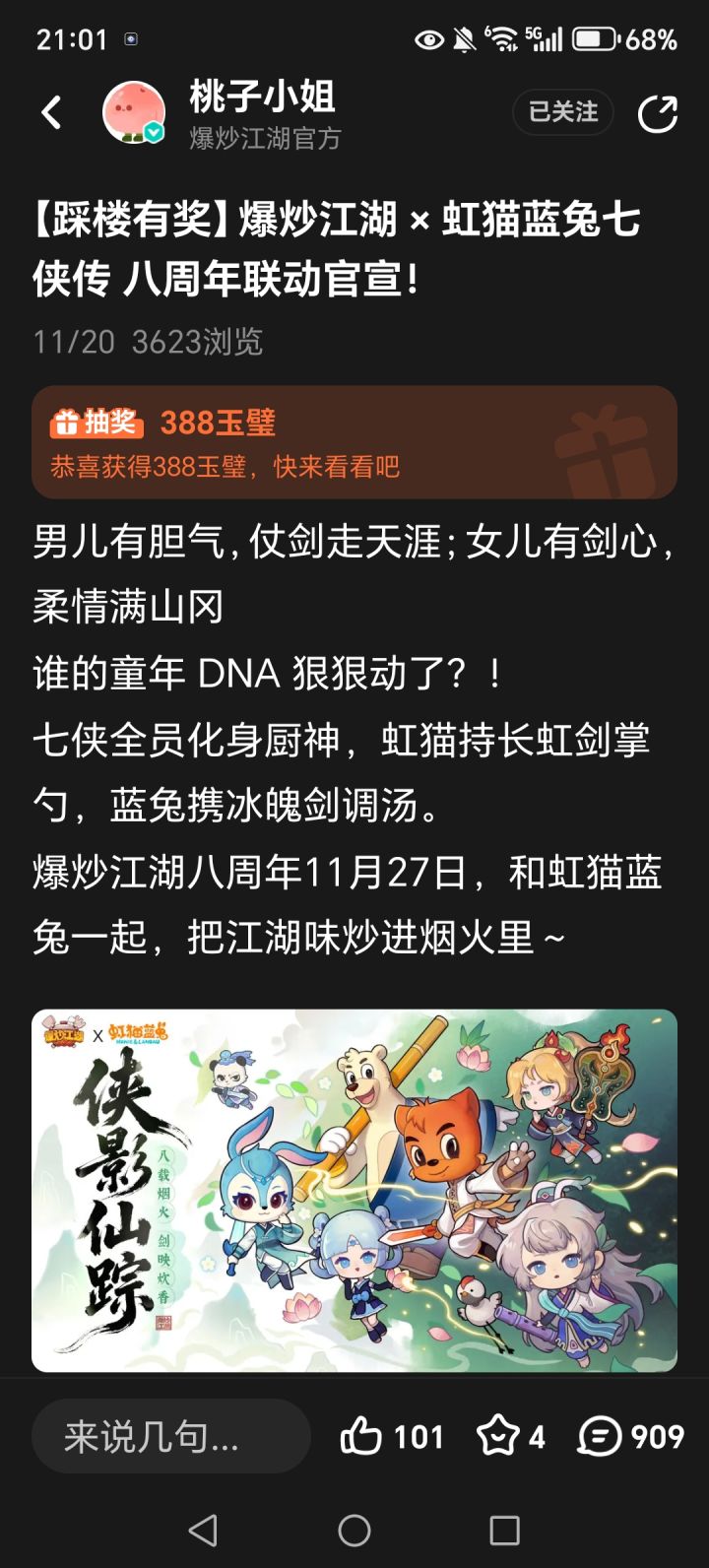八年之前玩的,看到联动虹猫蓝兔回归了(当时退游就是抽新池子太非心态崩了),游戏毋庸置疑是好游戏,最主要的是良心,我是零氪玩家,一分都没充过,但是还是玩的比较爽(当然是当单机游戏玩了所以爽)。第一次打开游戏看到官方公告说更新之后发更新大小(M)乘十的玉璧,我还以为跟某些马游一样铜币银币金币元宝,玉璧就相当于银币这个地位(错怪官方了不好意思)。