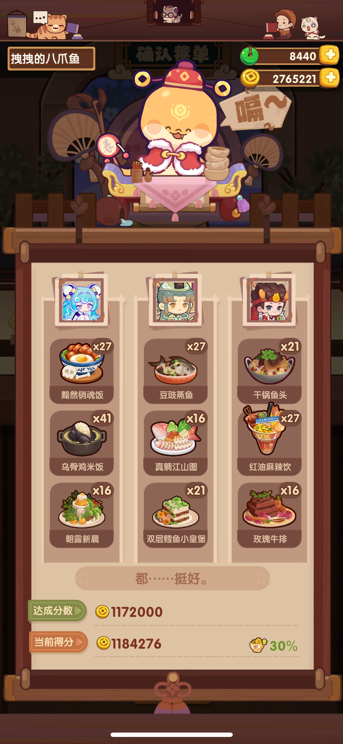 ①厨具是上期带的没改,应该比较常规,就懒得换了,没有装遗玉 ②我们小团体简直是太超模了 ③别问为什么不用小鱿,因为小鱿这期相对不适合,需要另一个思路,比较难教学[表情_生气] ok进入正题 简单来说,思路首先是放上我们无敌的小团体 然后无脑按着它推荐的最高分一个一个点上去,由此产生了图一 然后无脑再点一下,发现换个菜突然就能提二十多万分诶,即图二 原理是小皇帝的“三道炒:下两阶段切技法料理售价+5