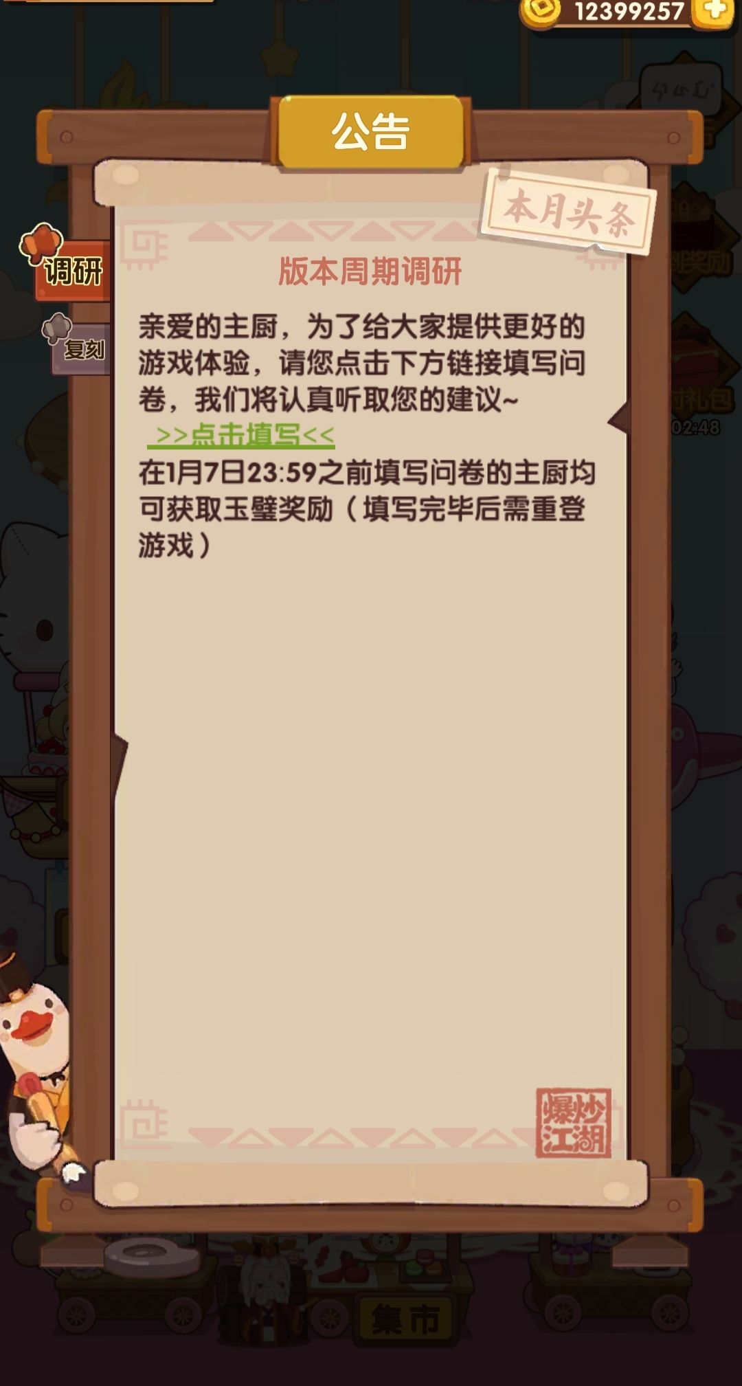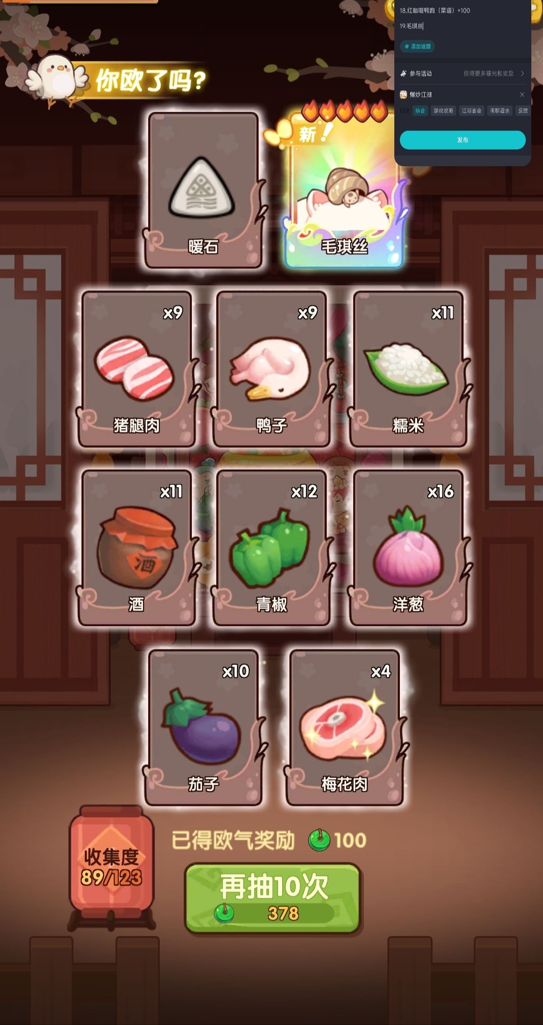 五火菜谱技法汇总帖已更新~ 新池比较深,我抽了两个号都是83发抽齐菜谱厨子,92发毕业。鸥in派对,all in的不止是大家手里的玉,还有积攒了大半年的符文菜(你说火焰山?一般玩家愿意刷吗),还有一直在膨胀的数值,还有我的主线(bushi)。跑这么多主线的时候真的有时候会想,如果能并行做任务就好了,没想到这个想法有一天真的变成了现实,这样做任务雀食很有意思,就是新人的食材可能遭不住。我没加速跑这些