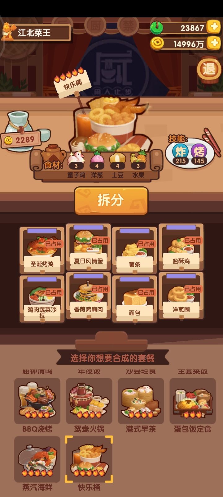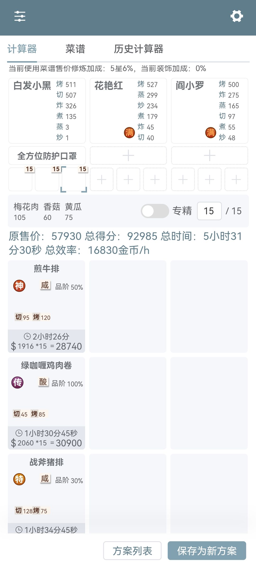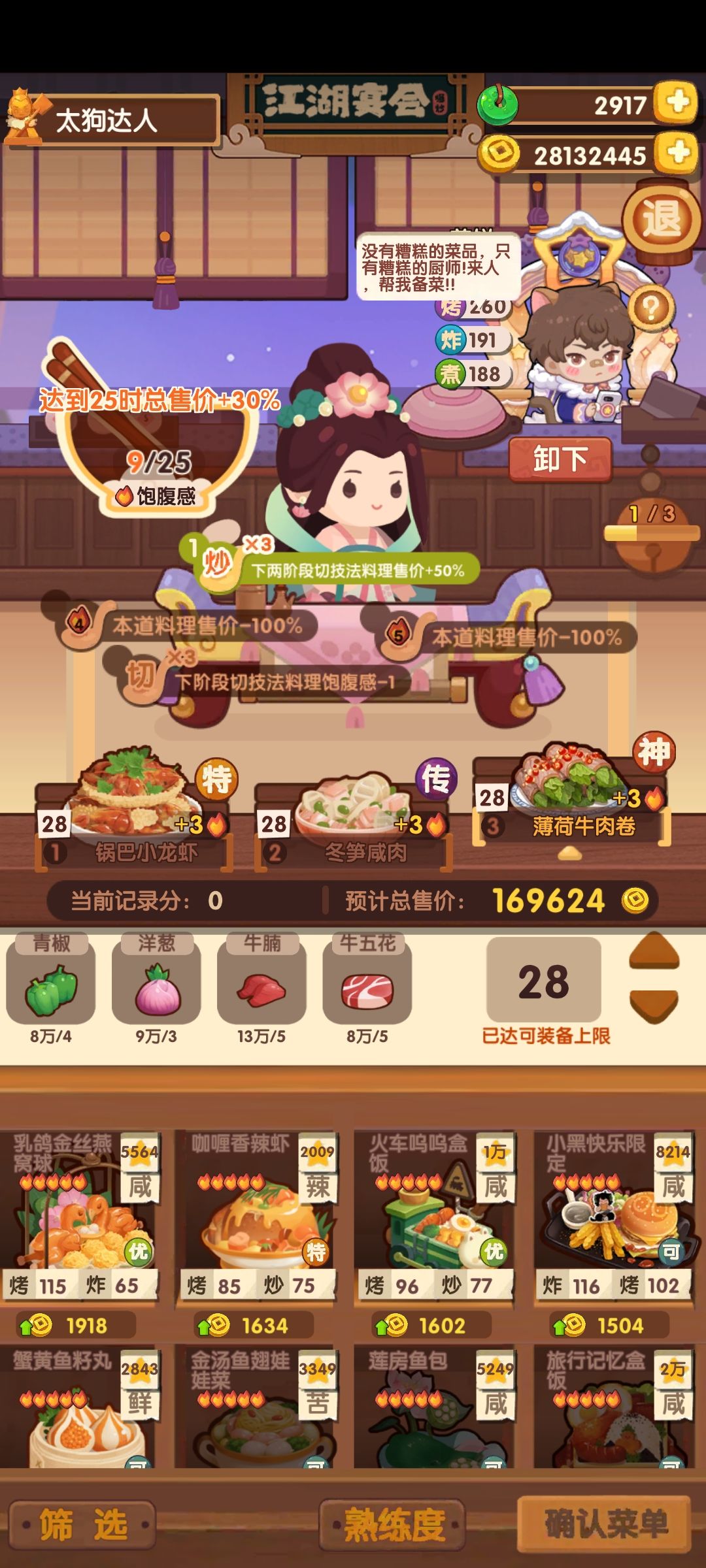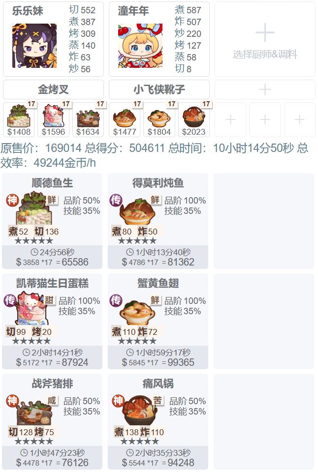 以这期宴会为例,白马王子第一个厨子意图是三道蒸,凑饱食度填了几个菜以后再选厨子 但是特图图是只对后面厨子做的蒸技法菜有加成,而我们后面所选的菜只有两道是蒸技法菜 所以目光转向舒婷的“肉类基础售价加成” 注意,舒婷这种厨子我们一般碎厨具很频繁,哪里需要往哪搬的性质,所以不建议用一些比较珍贵的厨具,随便丢点新手池厨具用用就够了 接下来我们转第二个贵客 这是我一开始的算法,阿狸还没有修炼,只是单纯凑了三
