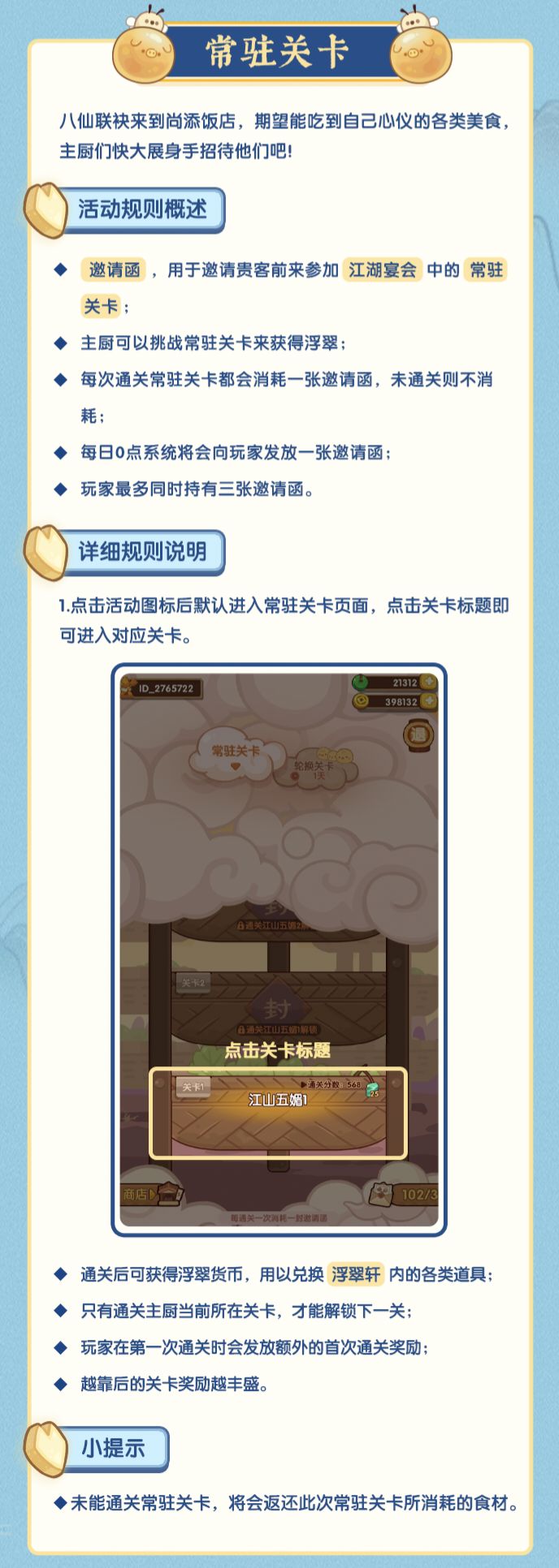 写在开头可能又错误,欢迎指正,萌新自己的理解。 新玩法分为两种关卡 1.常驻关卡:每天消耗1个邀请函可邀请到一个贵客,通关进入下一关,越到后面代币越多 2.轮换关卡(类比厨神):无次数限制可刷分 3.具体玩法 在宴会中给贵客上菜,有饱腹感,意图,状态三种要求 ①饱腹感:根据图中显示猜想为菜品星级,因此需要三道菜星级加起来正好等于贵客饱腹感时加成最多 2.意图:对应菜品技法,菜品对应相应技法会有加成