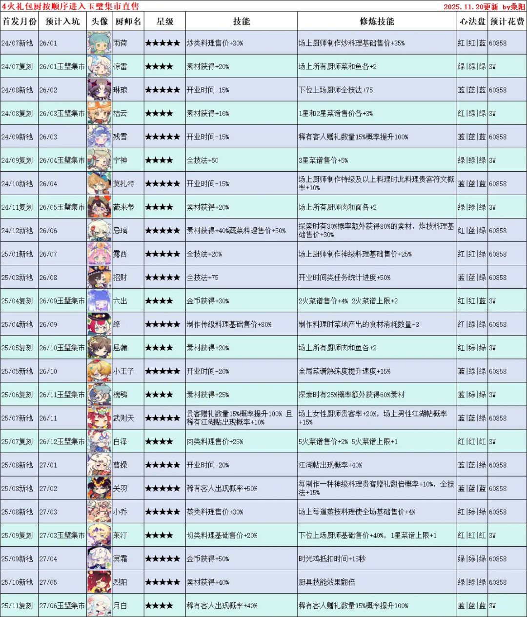 采集尽量选的是一些有两绿孔的厨子,补了一些厨具才够满采,实际上还有采集更高但绿孔更少的也能用 遗玉是我目前能到的最高采 ps:我只是零氪咸鱼,采集厨有更好的数值但我没用也就没做,各位酌情参考