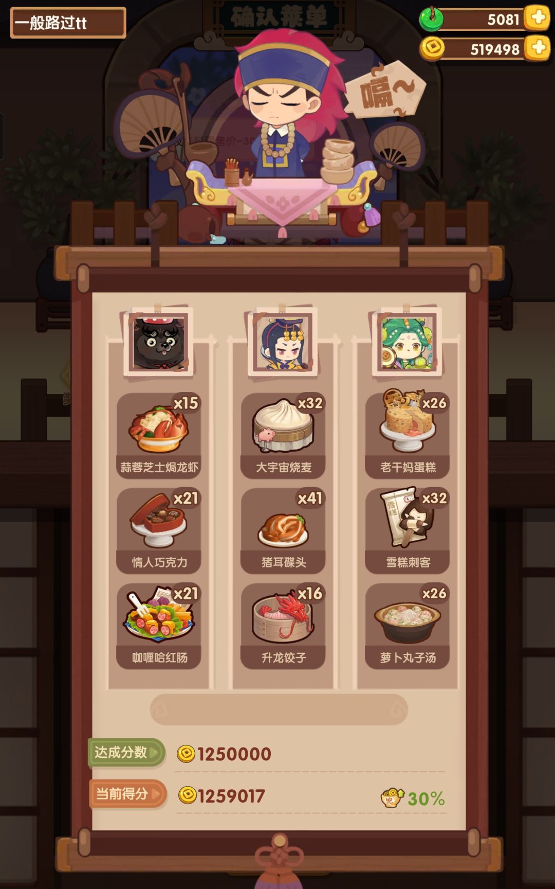 109+107=216w分的高容错作业,如果觉得配置太高可以转战上一个低配帖子 注意点:1-2(第一个贵客第二轮)第一道菜必须是神且不能是烤,给苹果可可彩蛋加buff,我的姒露带了霞姬霸捣药罐,没带的根据菜谱品阶调整即可,息夫人换成其余炒煮厨即可 2-2,经过修改,第一道菜必须是非四火非切的神级菜,给荔枝虾球上buff,其余没什么太大要求 厨具方面:煎饼:金平铲(没用);姒露:霞姬霸捣药罐;黑柏: