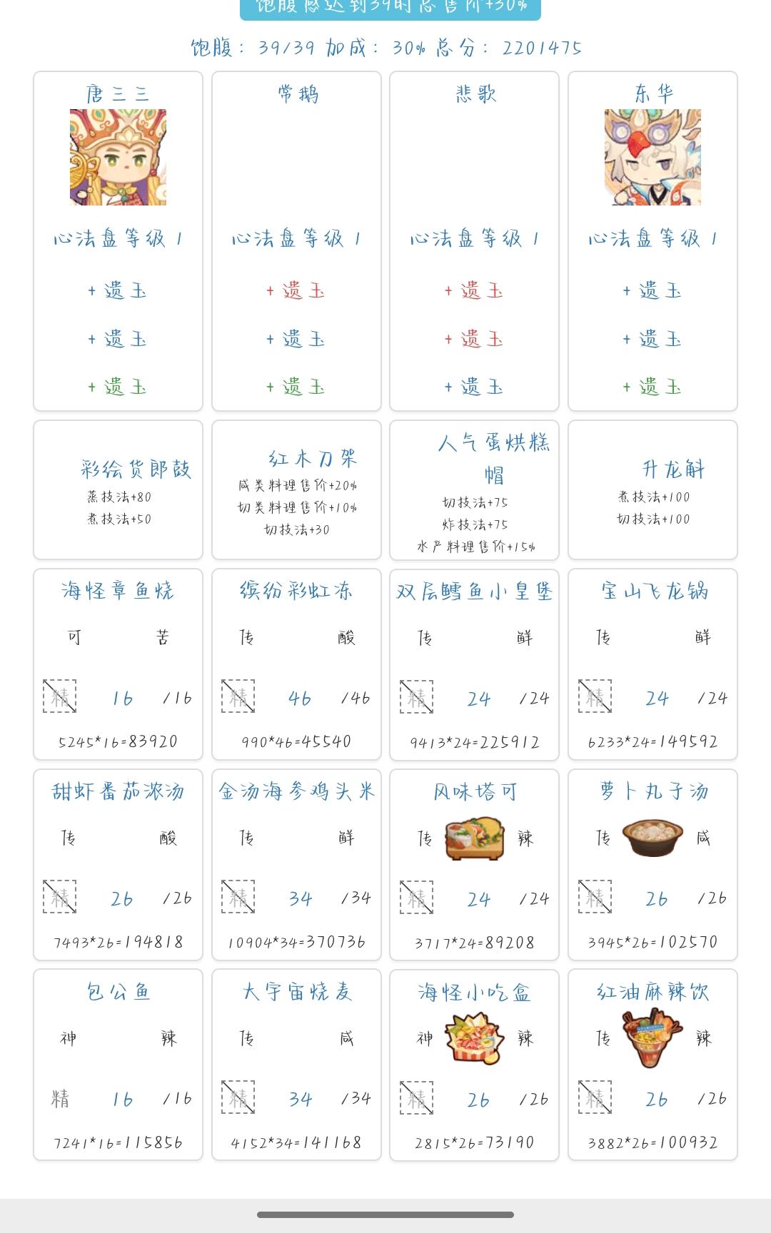 这是调整过的低配作业,高配我只后会出,图一次只能发九张ヽ(゜Q。)ノ 常见问题:1-2(第一个贵客第二轮)第一个菜是神级,且不能是烤,避免把第二道菜的buff抢了,我这是有容错的,苹果可可彩蛋放第二位分更高,但是我姒露装了捣药罐…… 还有就是2-2的,更新过意图之后,第一道菜也是要神的非四火非切的菜,来保证第二道菜叠buff 最后说一下厨具方面:十六:秘籍;姒露:霞姬霸捣药罐;魔力橙:金漏勺;黑柏