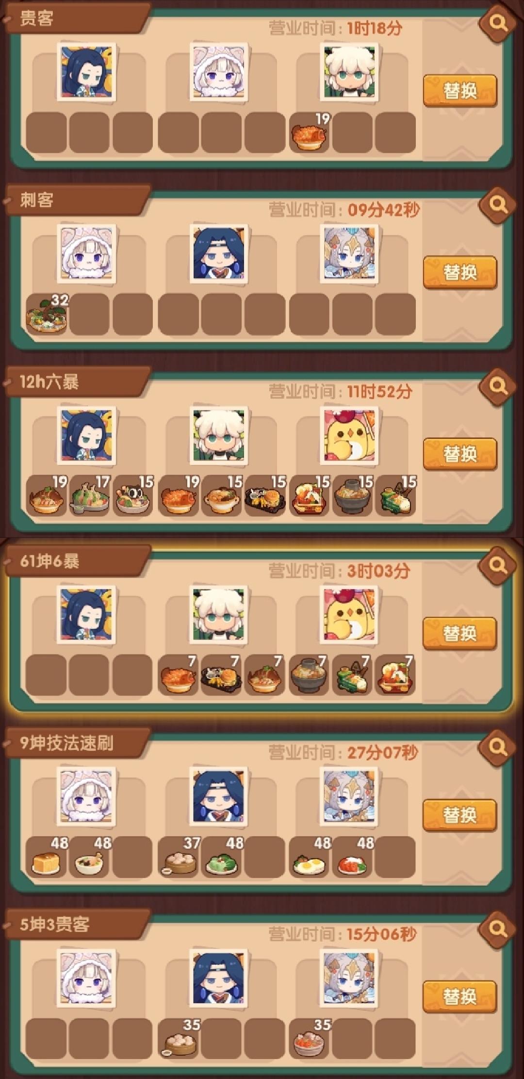 编队功能很好玩,总共10队,我现在脑子里就只有这六种想法。(唯一缺点:这玩意不能像白菜菊花一样保存白板,必须要上菜) 前两个常规的贵客队和刺客队。 第三第四是为了六爆,因为已有全菜谱都专精了,枯燥乏味之际,搞点金符文六爆挑战。 第五第六为一些任务量身定做。
