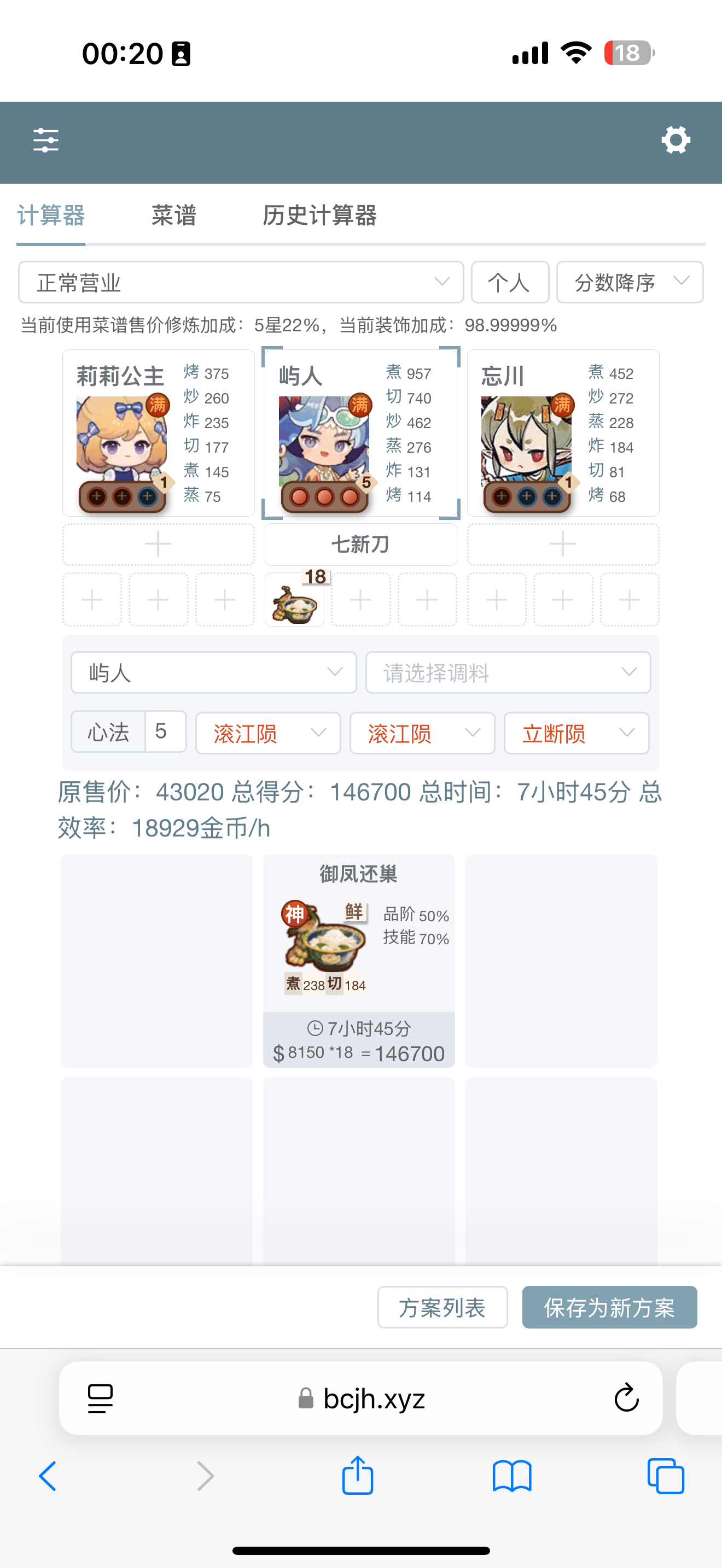 我的思路是先用计算器跑一个差不多分数,再试厨师和菜来凑分(如图一) 复刻抽完桃花池,没有炒鳝糊的可以用冬阴功汤,分数差不多的(别的也可以试试) 图二只有老干妈/蛋糕,蟹酿橙专精;图三也只有一点不方便面,麦片鱿鱼圈,荔枝虾球专精,没有专精的话这几天可以刷刷看 图四是基修,不算高,影响不大 煎饼:一无锁知钥匙,炒+30%,三星+20% 姒露:豪华甜品架,切+30%,三星+20% 墨雪:南玉足印,切技法