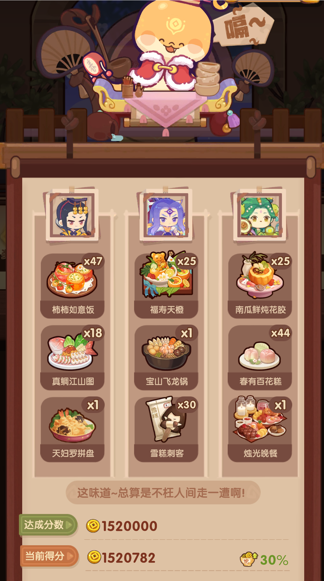 下午试了一下,过家家萌新平民(相当于厨师和上限也可能少一点),没生蚝年夜饭仙丹之类是大概到不了第四档的,除非大部分用三星厨具,但是有点不值得。(大概全二星厨具能到230-240万左右) 于是摆烂做第三档好了,十分轻松,也很开心。