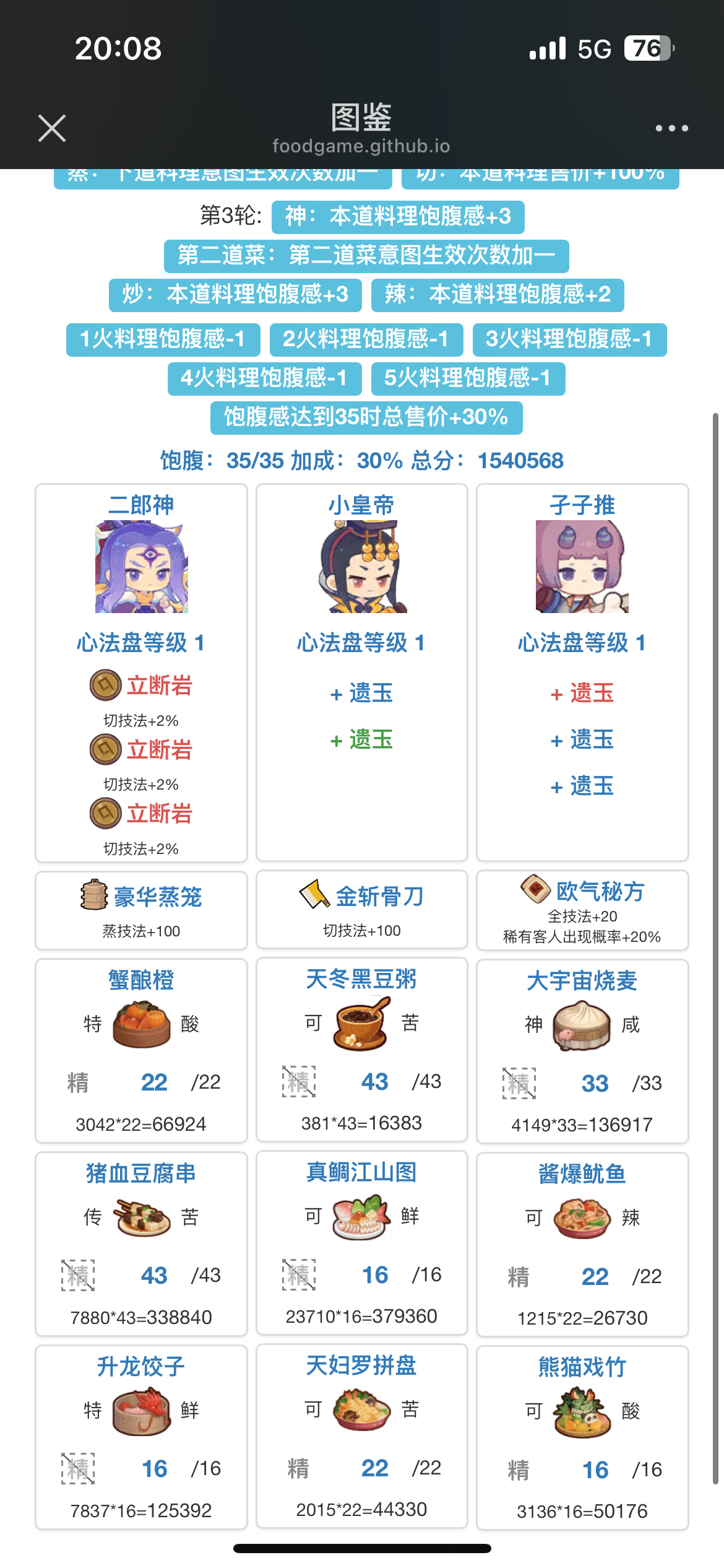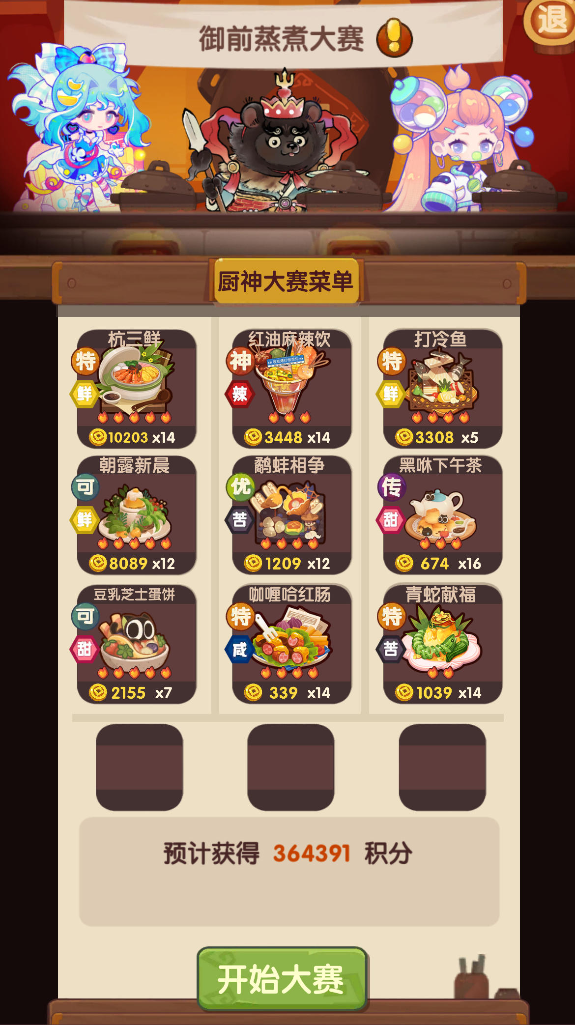 好几次卡在四档,这次终于够到最高档了 图一是程序跑的,图二图三是具体试菜之后改良的,基本都是最近几个池子的菜,对新手非常友好。 没开后厨也没关系,月色荷香可以换成青柠金汤翅捞饭,沙县轻食可以换成老干妈 蛋糕,三文鱼拼盘可以换成苹果可可彩蛋,实验室的菜自己换换再凑点厨具应该也能过 鹿小驯(已修炼):计时鸡蛋,蒸售价+20%,三星售价+15% 黑柏:金塞醒酒壶,煮售价+30%,三星售价+20% 虎莱(