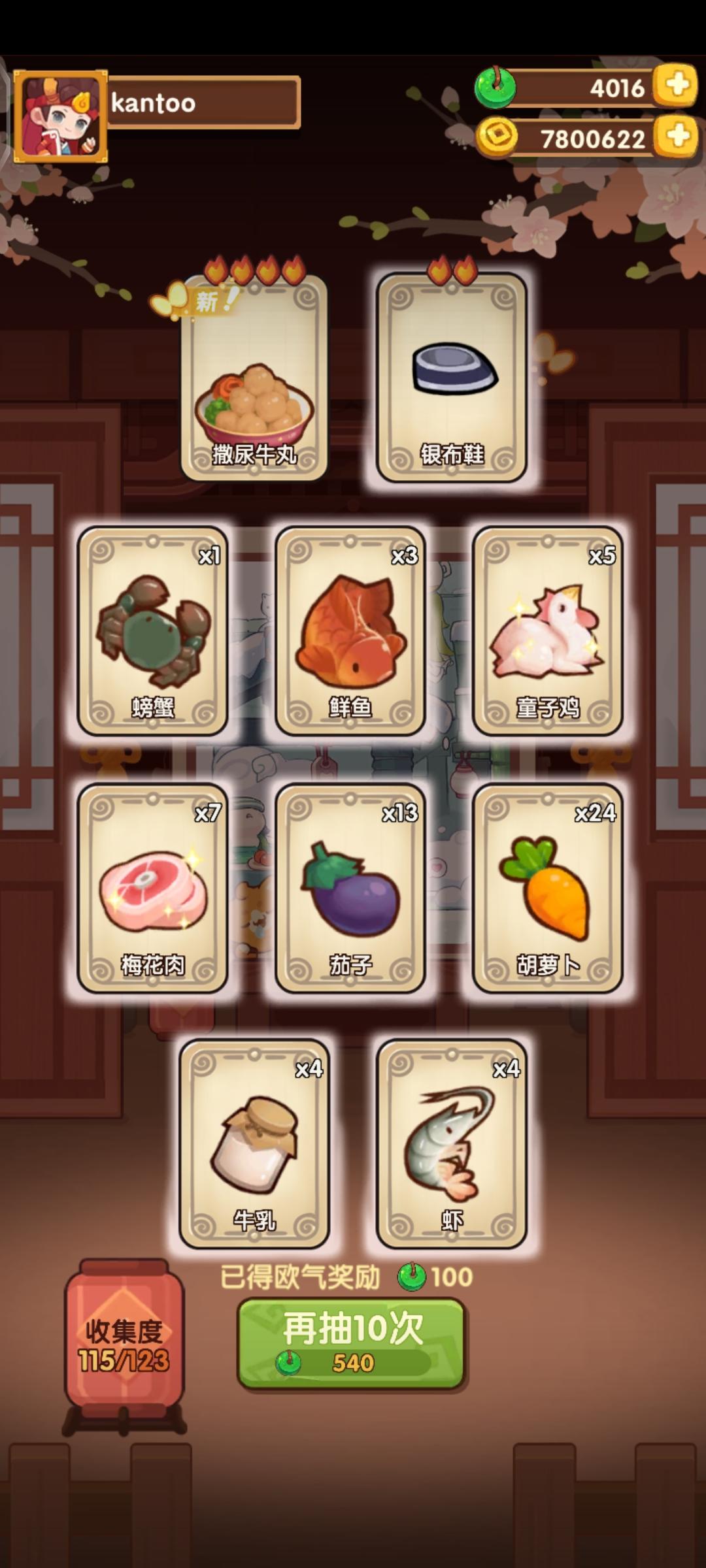 消耗:378×81-2100=28,518 1.杏婵(2火厨) 3.装饰+欧气100 5.船夫(1火厨) 7.茶娘子(1火厨) 10.片儿川(3火菜) 11.今珏(5火厨)+欧气100 14.话梅小番茄(1火菜) 17.装饰+欧气100 18.桂花鲜栗羹(2火菜) 20.装饰+欧气100 23.西湖醋鱼(4火菜)+欧气100 27.装饰+欧气100 29.桌子+欧气100 33.装饰+欧气100