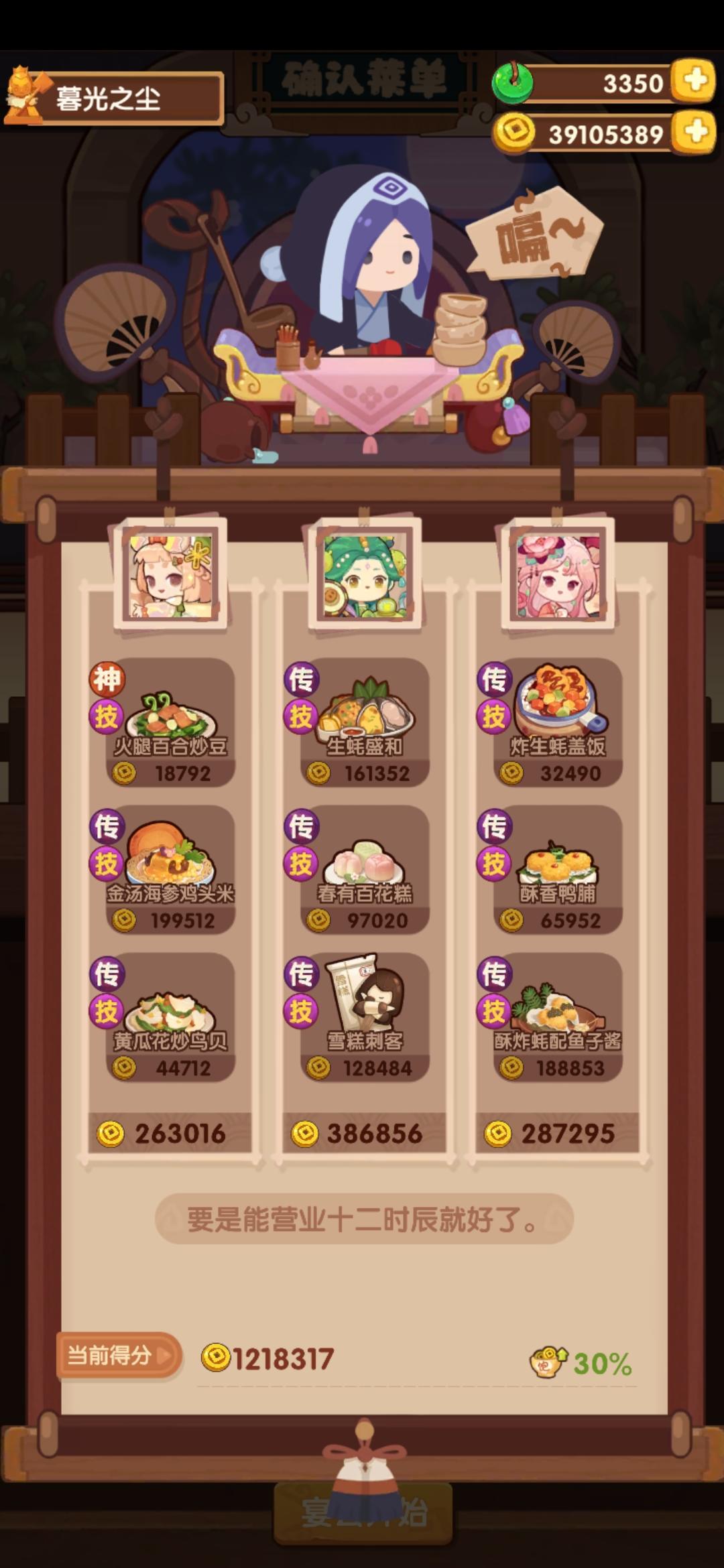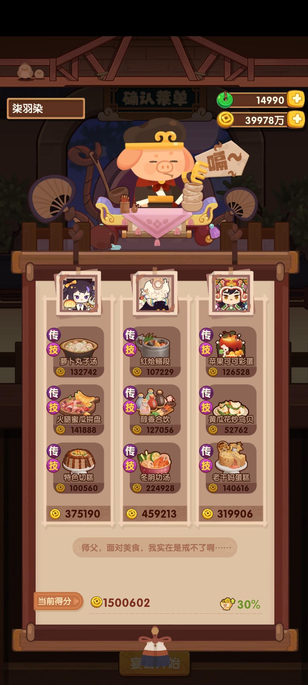 第一次御前高保没别的炒厨子了还好有送的洛竹,用了俩厨具一个加20%炒售价给洛竹一个加15%切和15%菜的给司姬。有更好的菜就不用厨具。