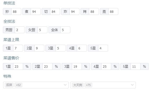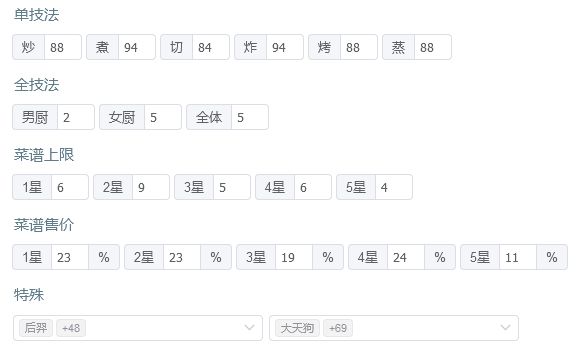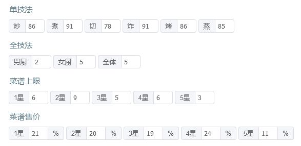国际惯例的全员无厨具、无遗玉、无礼包厨(坑除外),修炼接近无氪满修炼,具体数值在下方,东西在评论区里。 全员有修炼。 全菜谱无专精,五火菜谱上限17适用,上限17总分3261754,上限18总分3292335,上限19总分3322917,上限20总分3353498。 【作业常驻的限制列表】 *预警:如果无法满档会适当解开限制* 沙县轻食、全套菜饭和月色荷香之外所有后厨菜不上场。 生蚝盛和与仙丹不上