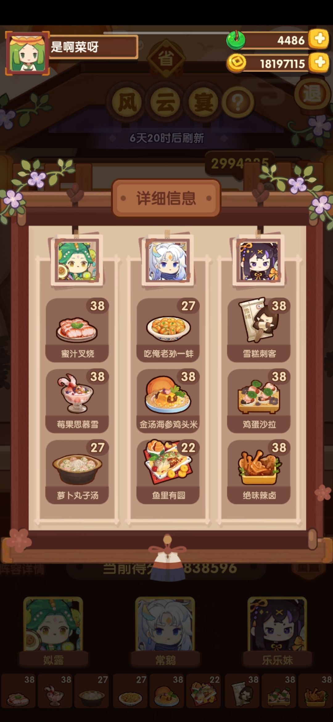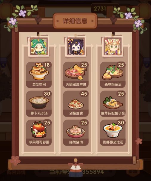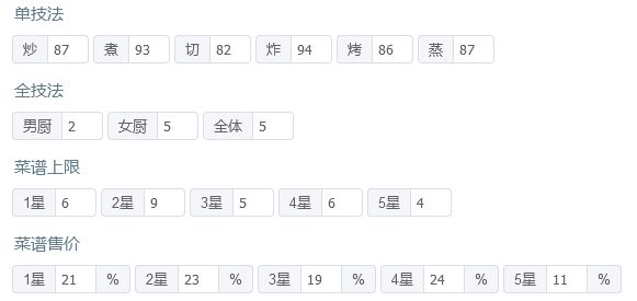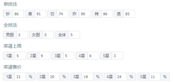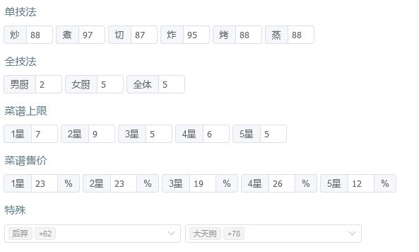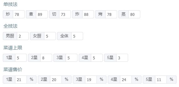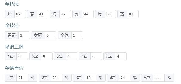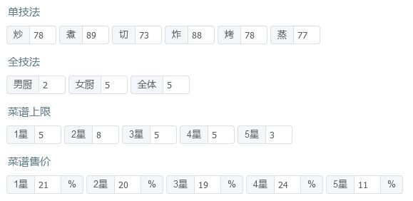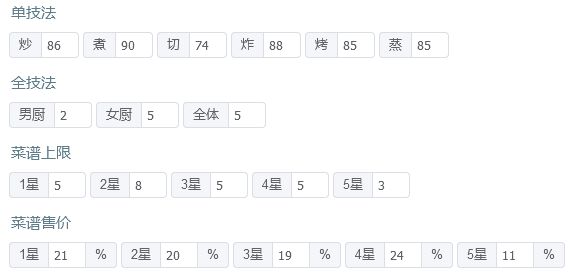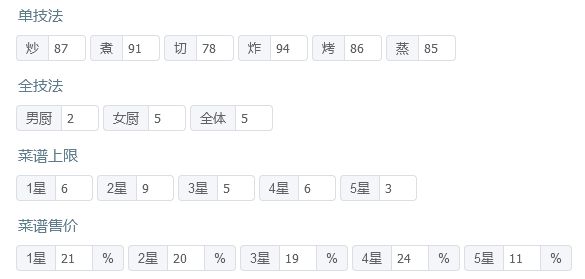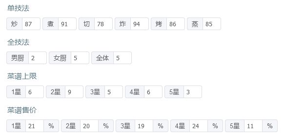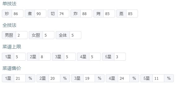 有后厨菜春日有宴,樱樱樱池的痛风锅,如果都没有的话就找同档次的才替换一下,再加点厨具应该也能过 P3是修炼数据,男厨全技法+2,女厨全技法+4 厨师厨具: 姒露:豪华甜品架,切售价+30%,三星售价+20% 常鹅(已修炼):无厨具 乐乐妹(已修炼):金刚磨刀钢,切售价+20% 达浪:妙手回春中药柜,蒸技法+150,炸售价+25% 露小驯(已修炼):计时鸡,蒸售价+30%,三星售价+20%小青龙(已