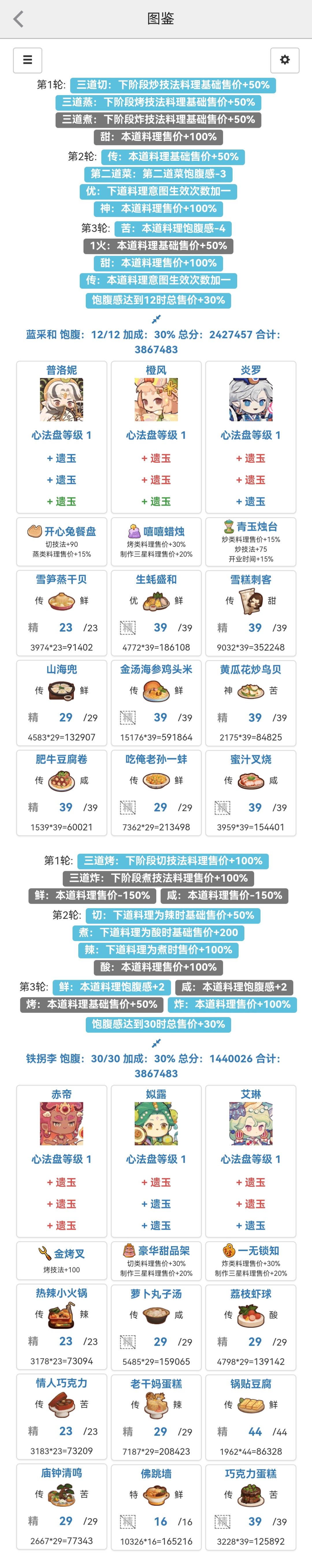 国际惯例的全员无厨具、无遗玉,修炼偏高,具体数值在P3。 乐乐妹、唐三三、句茫、气仙人和玉涂有修炼。 全菜谱无专精,五火菜谱上限17适用,上限17总分2699050,上限18总分2711204。 【替代方案】 通用: 玉涂无修炼可找凯丽,用凯丽的情况下最好把烟熏鲑鱼换成沙县轻食来撑高分数,碧绿响螺片可替仙丹,生蚝盛和不建议替,因为要用大量的专精来换分数,当然你有年夜饭或者是蒸汽海鲜这些后厨菜的话当
