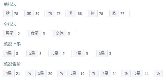 国际惯例的全员无厨具、无遗玉、无礼包厨(坑除外),修炼接近无氪满修炼,具体数值在下方,东西在评论区里。 全员有修炼。 全菜谱无专精,五火菜谱上限17适用,上限17总分3258480,上限18总分3272639,上限19总分3286799,上限20总分3300959。 【作业常驻的限制列表】 *预警:如果无法满档会适当解开限制* 沙县轻食、全套菜饭和月色荷香之外所有后厨菜不上场。 生蚝盛和与仙丹不上