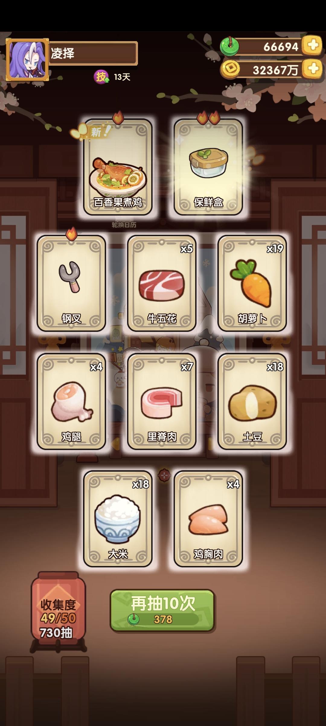 后续抽池顺序:龙春 -> 荆楚 -> 双11 -> 仙境 先补荆楚池的清蒸武昌鱼,把符文菜抽齐。 后面补池优先考虑国家队的修炼菜,如果有多余的玉,用来补双11和仙境,修炼潼年年(炸煮双环)和莉莉公主。