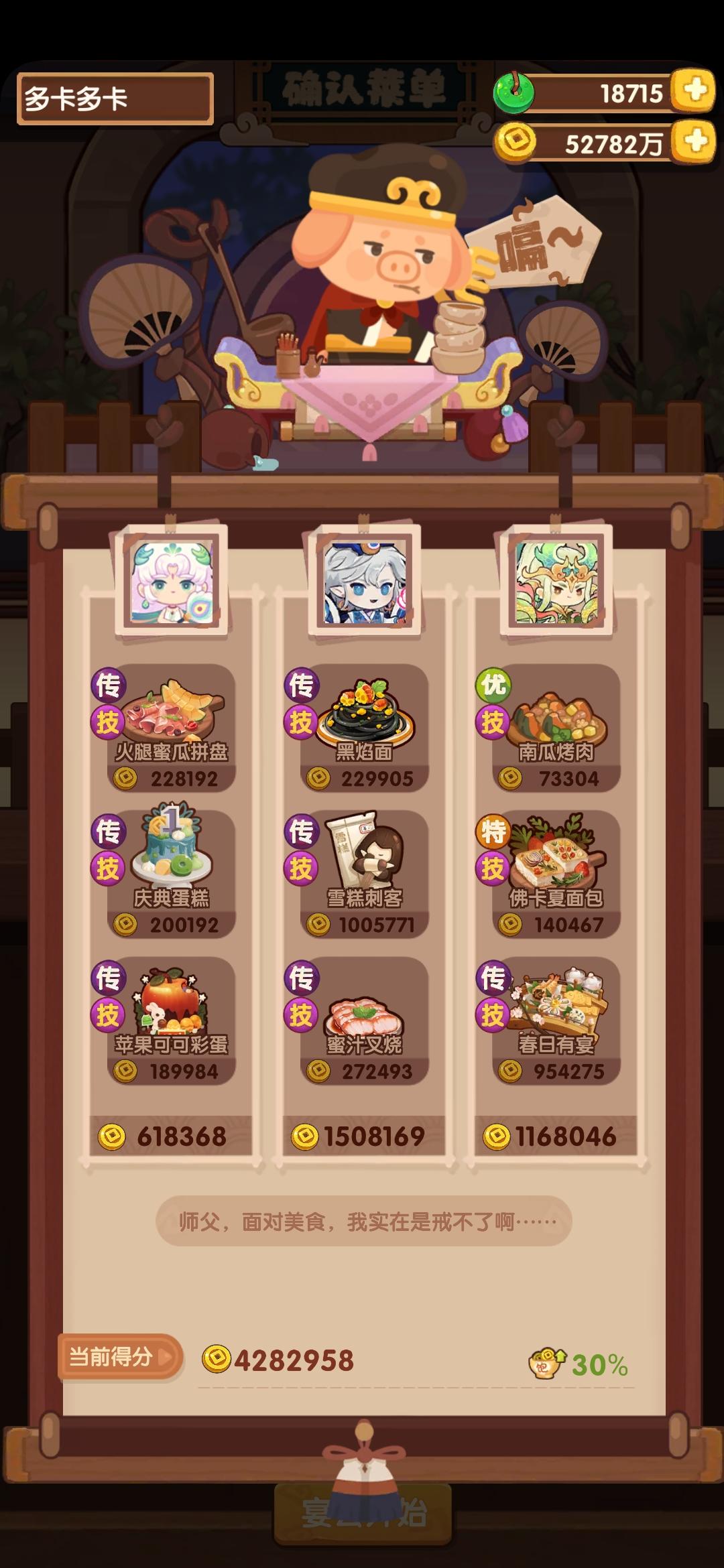 何仙姑饱食度给的很大方,第一轮就能满档。核心就是第一个角色做3炒菜。舒婷下位替代小皇帝(30%售价),贝多分(单人做菜强,不过后续走二郎神路线可能没高分炒切菜来吃贝多分buff) 今天想起来胡喜媚还没做,之前看到3🔥切酸,下意识用悲歌做荔枝虾球吃双倍buff,然后饱食度不够用,第一个厨做不了5🔥吃100%售价,最后得分在160w左右。可以在第二道菜用4🔥,宝山飞龙锅-6饱食度。[表情_捂脸哭]当然