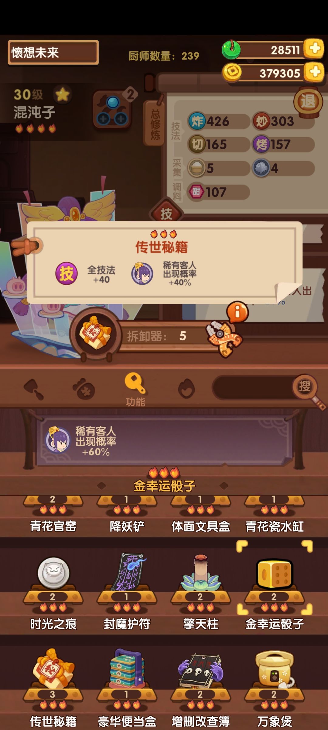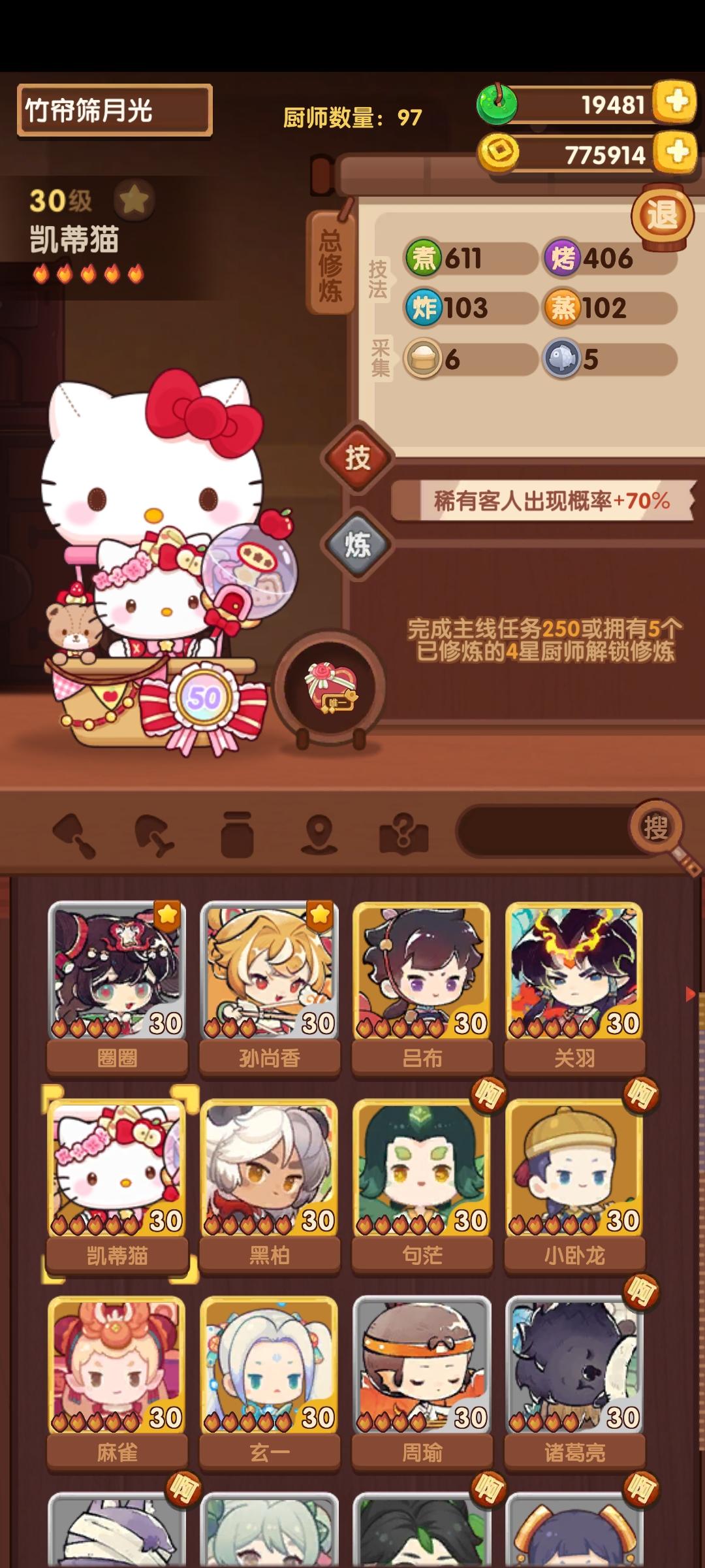 一天桌,日均231(龙春229.5),我甚至看了几次确认没有算错。推荐抽取,缺点就是日桌且比较赌。 五火将军过桥,炸煮鼓风机菜,贵客是刘关张(与咖喱香辣虾、火焰山冲突),白发做到特级需要秘籍、接近满的煮基修和遗玉,凯蒂猫特级需要厨具,具体用法需要后续研究一下。这个菜消耗鲜鱼和大量猪油,用它刷符文需注意。 插播一条小bug:刚进名厨录的时候厨具很暗,等一会儿才显示清楚。 四火蟠龙黄鱼,萌新友好炒炸菜