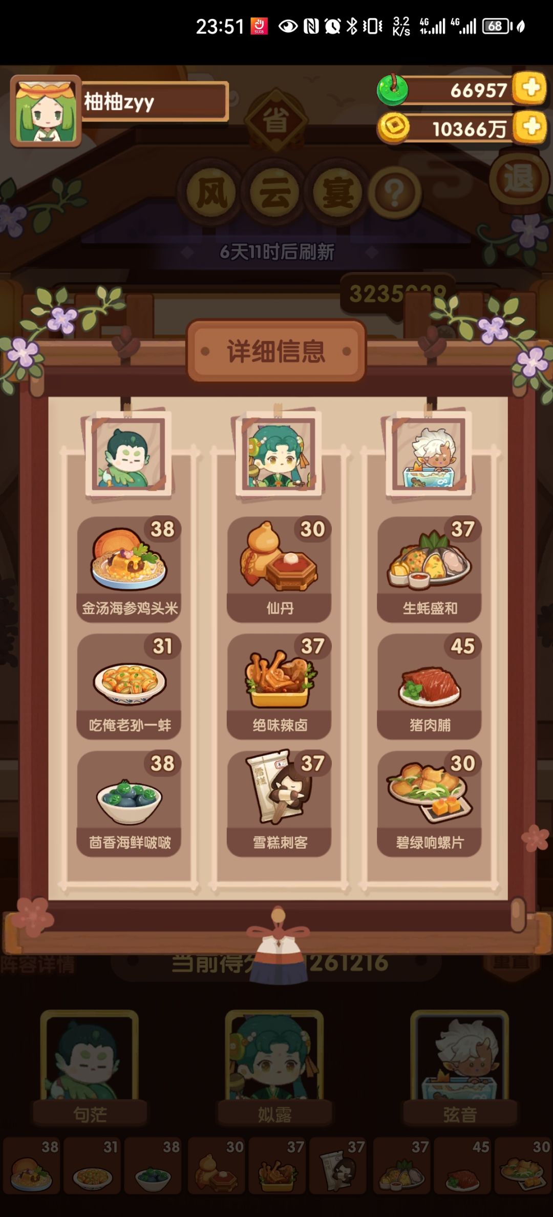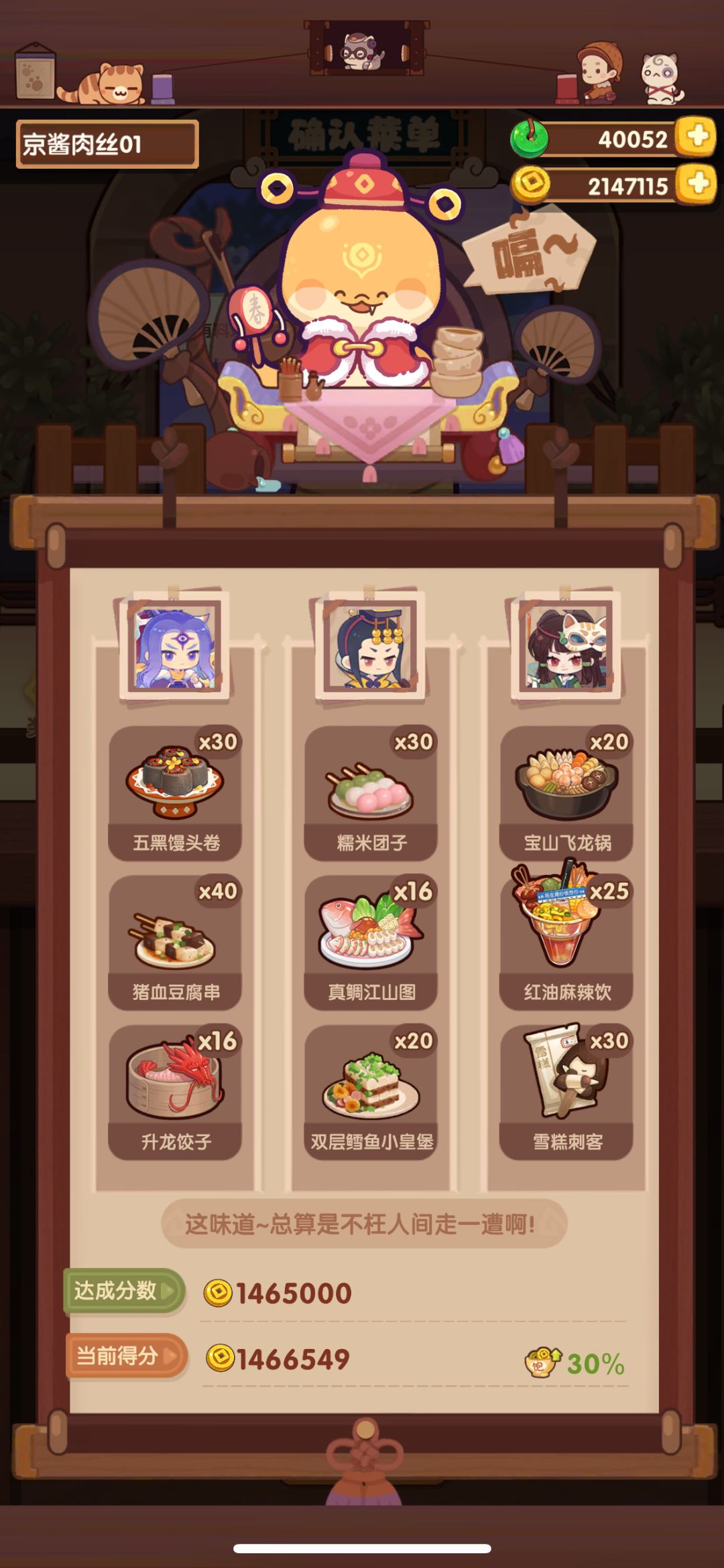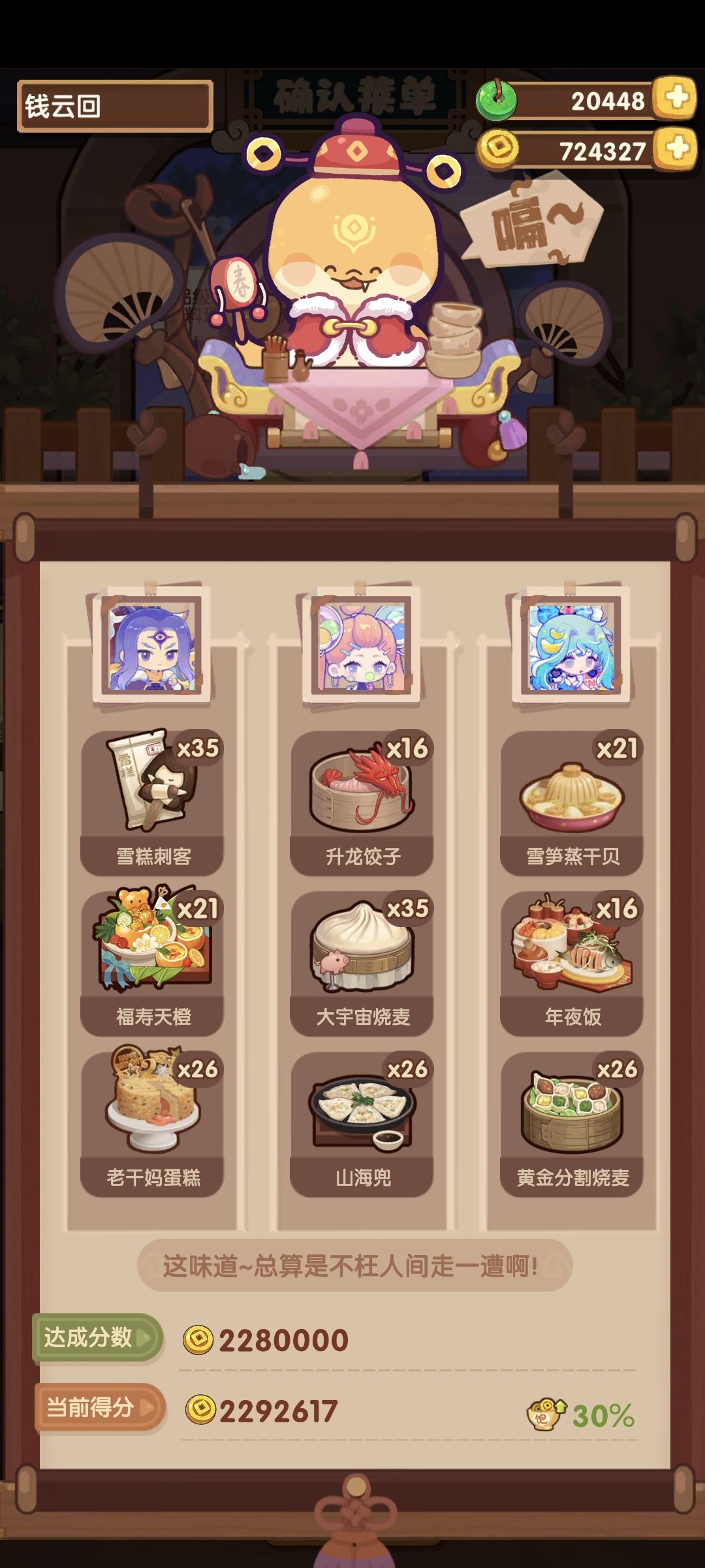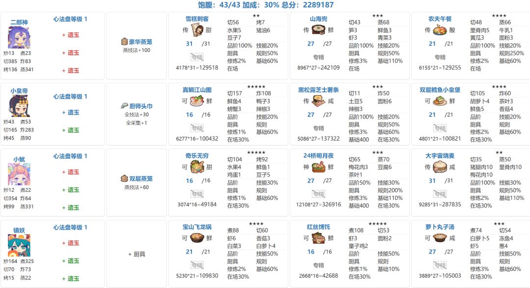 分数调整空间不大,随缘抄 尽量绕过了年夜饭大烧麦,但这关不用鲜鱼和梅花肉感觉不太能成,省不了只能上了[表情_嫌弃] 厨具依次:+80蒸,+150烤,+125煮,+100烤 基修40-50 有些厨具比如普洛妮的应该不用也行,特图图可替换普洛妮