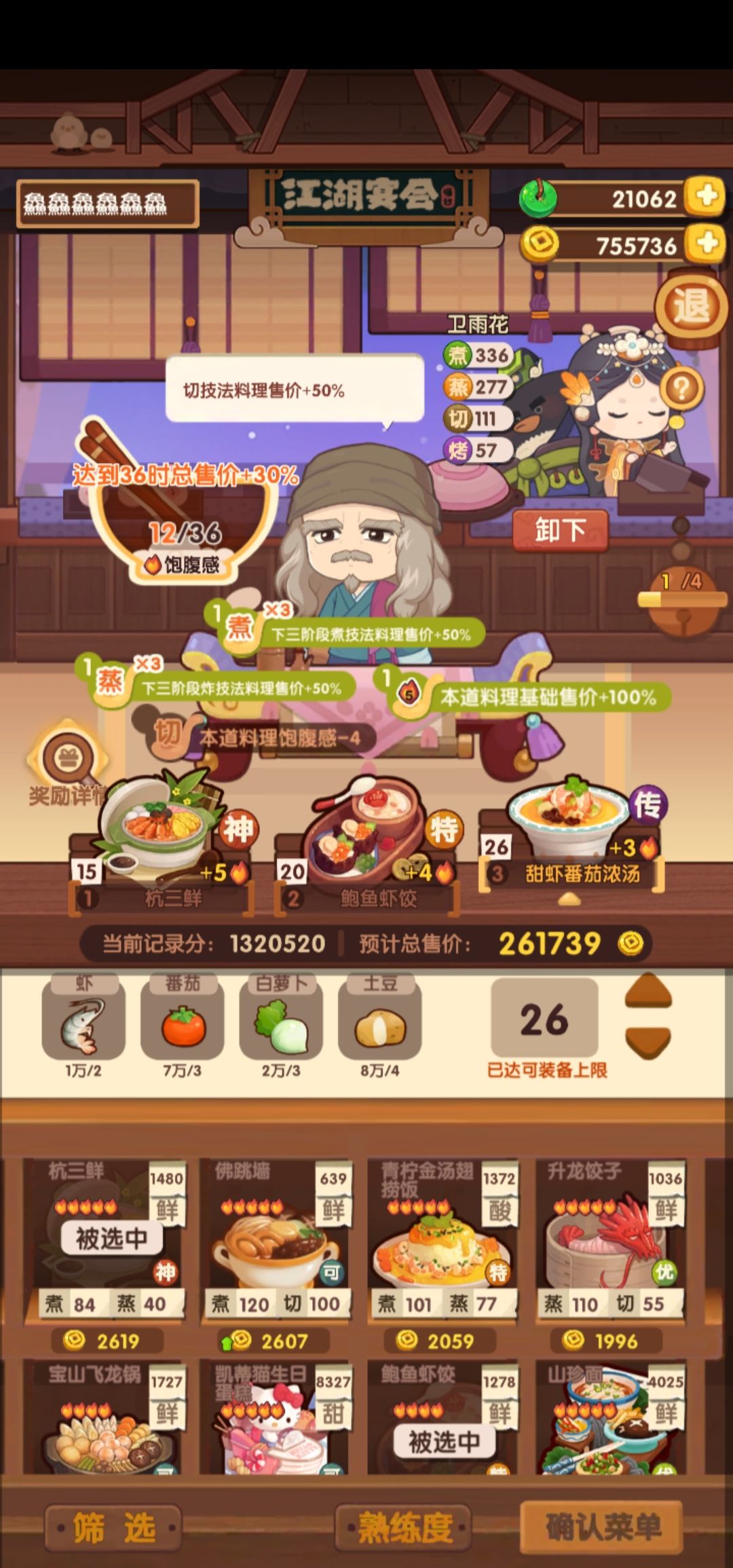 试了半天总算试出来了。 思路是第一回尽量全蒸煮,后三回尽量凑高分。注意第二回避免上甜菜,给后两回空饱食度,第四回凑高分+饱食度