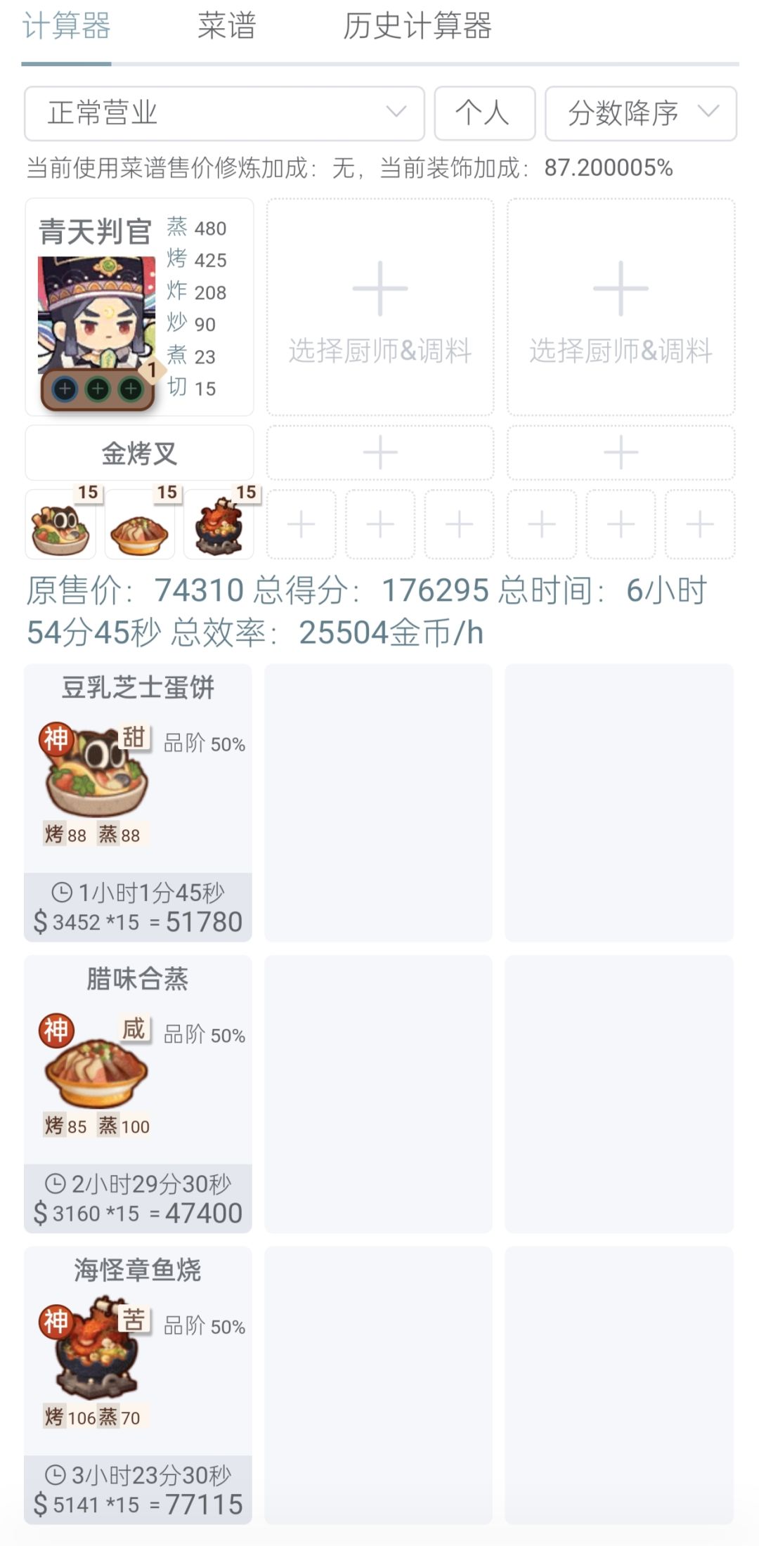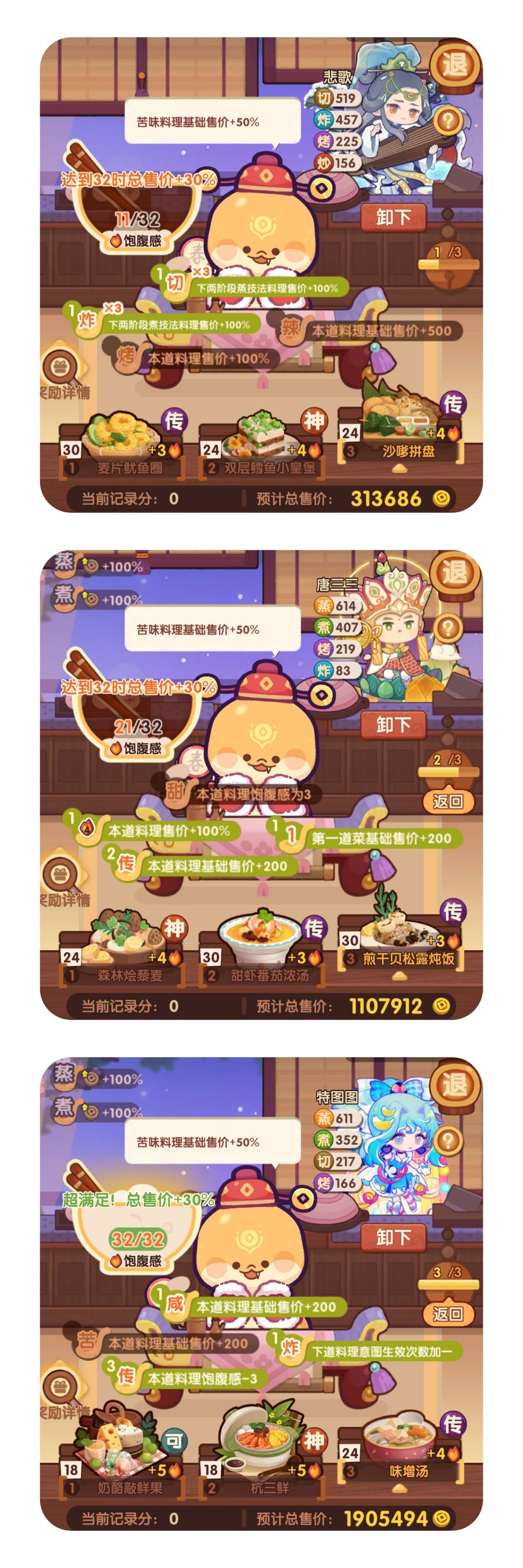 入坑一百三十天左右,0氪,供参考 1.二郎神和小皇帝都修炼了 2.三个厨师都有带厨具 二郎神带了辉光滚灯(豪华蒸笼也可以) 小皇帝带了金斩骨刀(银的也行) 山肴带了金顶厨师帽(加切的厨具应该都可以,但我没试,不确定) 3.二郎神的第二道1火菜换成糖渍小番茄等需要切技的1火菜得分更高 #爆炒江湖