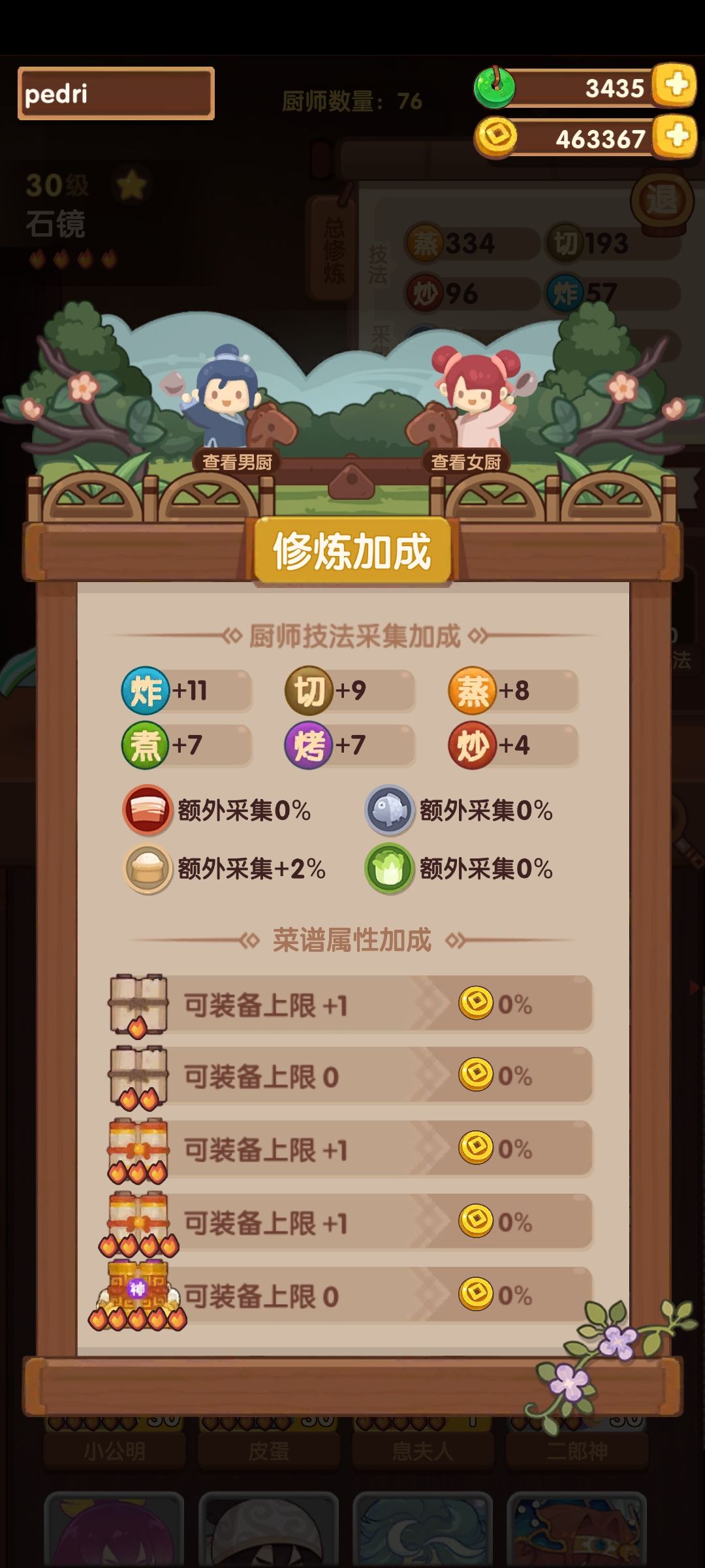 特图图、悲歌、藻白以外均修炼,厨具是之前装的但应该非必要