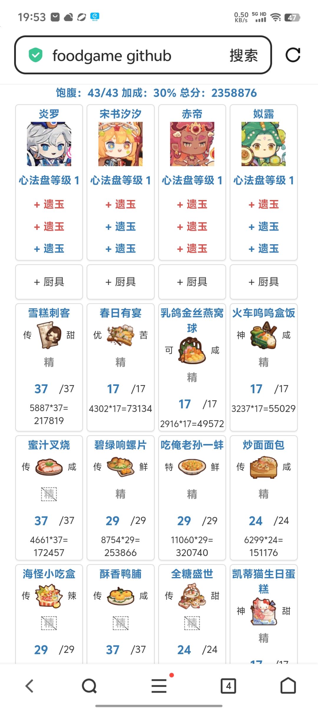 因为品级影响饱食度,厨具和基修影响比较大,个人建议收集度过半的咸鱼参考。 厨具都是厨师自带的,没有换,基修50左右。