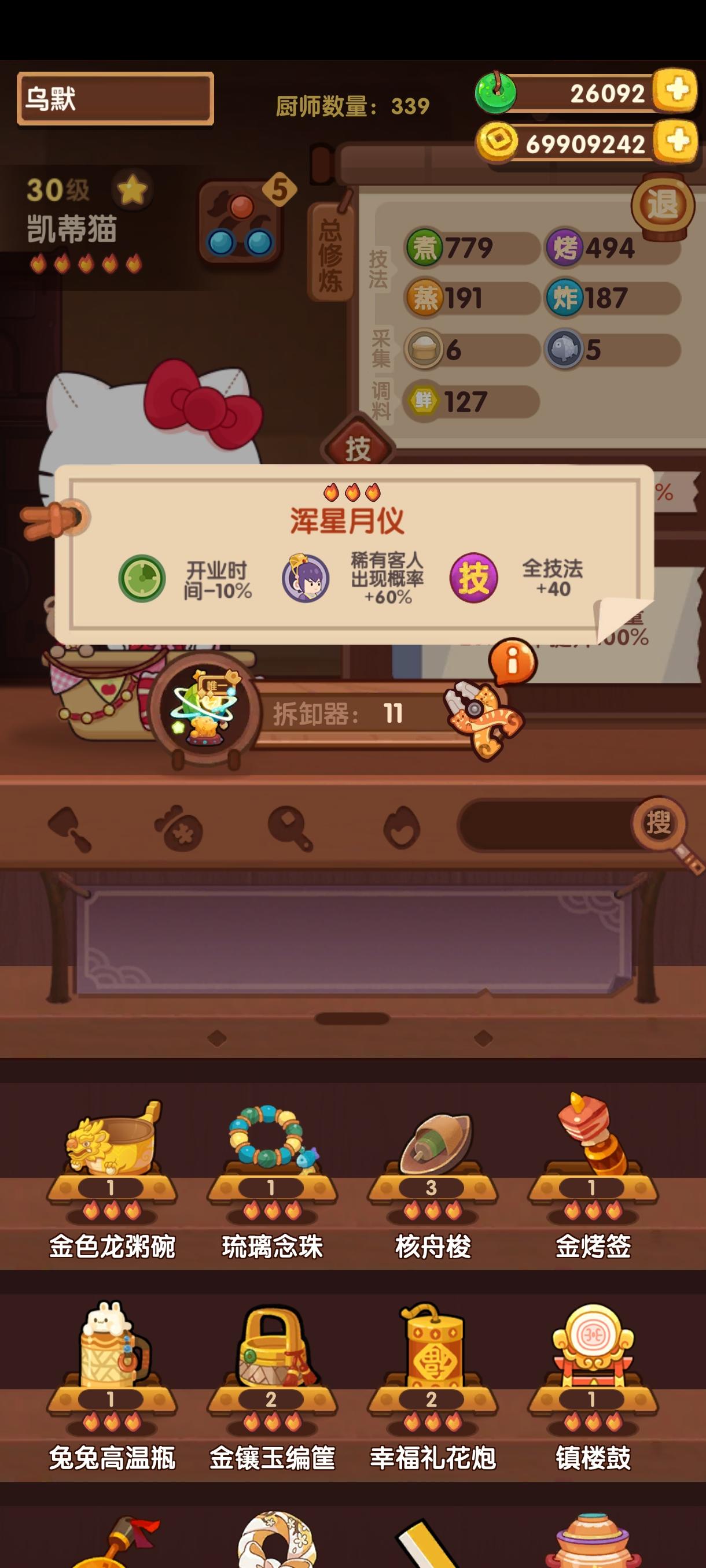 算分感觉差那么一两分的有没有可能问题就是比人家少菜谱数量呢 去修炼啊!!去修这些啊 以我目前游戏体验来说,优先级是小皇帝二郎神(萌新独一档体验),然后就是菜谱上限+1厨子,再就是售价+1%厨子,抽到厨子都去看一看呐 修炼的时候也不要太死板,睡觉前就把能修炼的厨子怼上凑个十来个小时一觉睡醒刚好修满,旁边放一到两个厨子还能蹭蹭修炼时长一次修仨( 你怎么知道我厨子基本让我混满了[表情_微笑]不修是因为缺