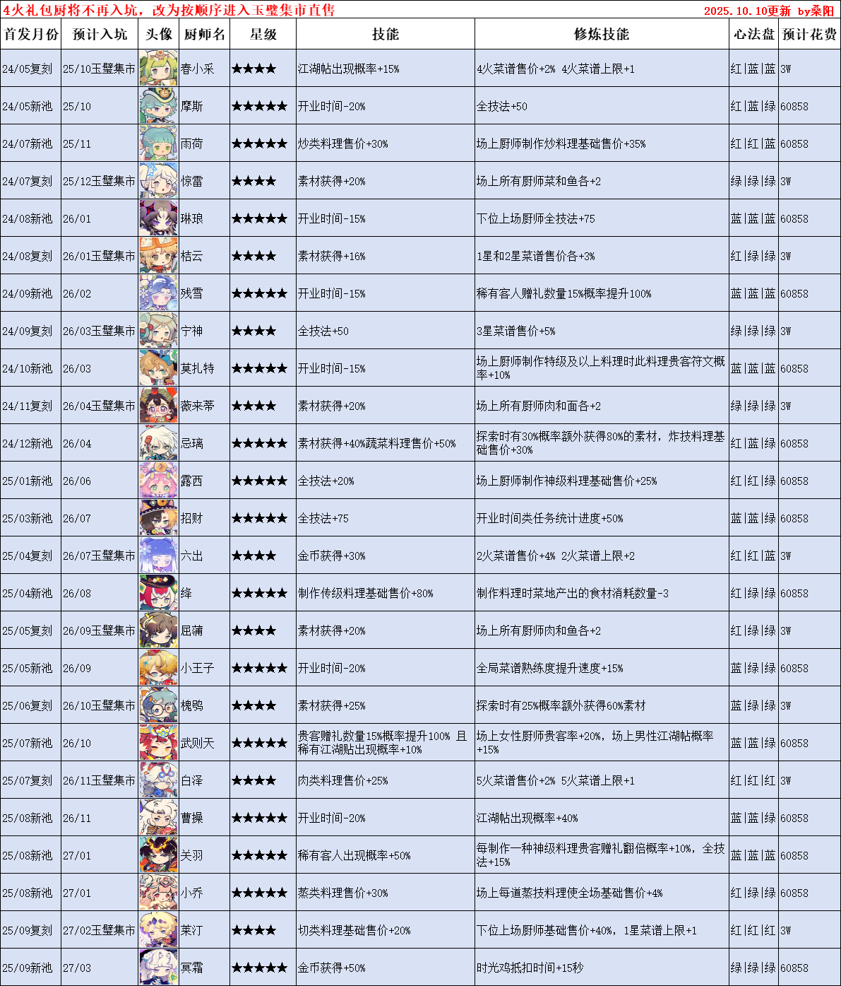 在写江湖贴厨师评级和菜谱评级之前先写队伍推荐吧,江湖贴队伍分为两个,一个是纯刺客效率队,一个是过夜队,这里先写过夜队伍推荐,刺客队其实比较简单我到时候简单写一下 由于过夜三刺客是溢出的所以,使用两刺客加莫问的搭配做9道五火菜进行过夜,以下选取几个队伍进行推荐 推荐一:裘小白贺岁传统队 队伍构成:裘小白贺岁莫问 江湖贴概率:108% 稀有江湖贴概率:10% 减时间:58.33% 所需关键基修:炸83