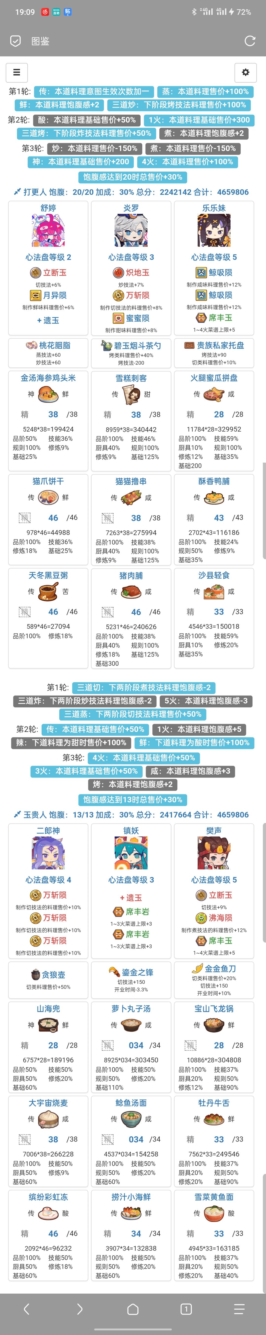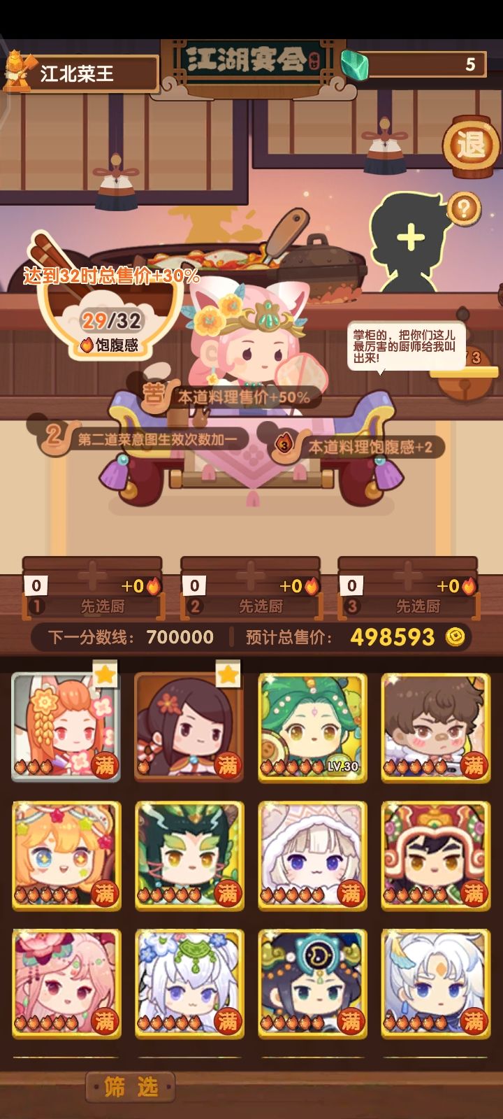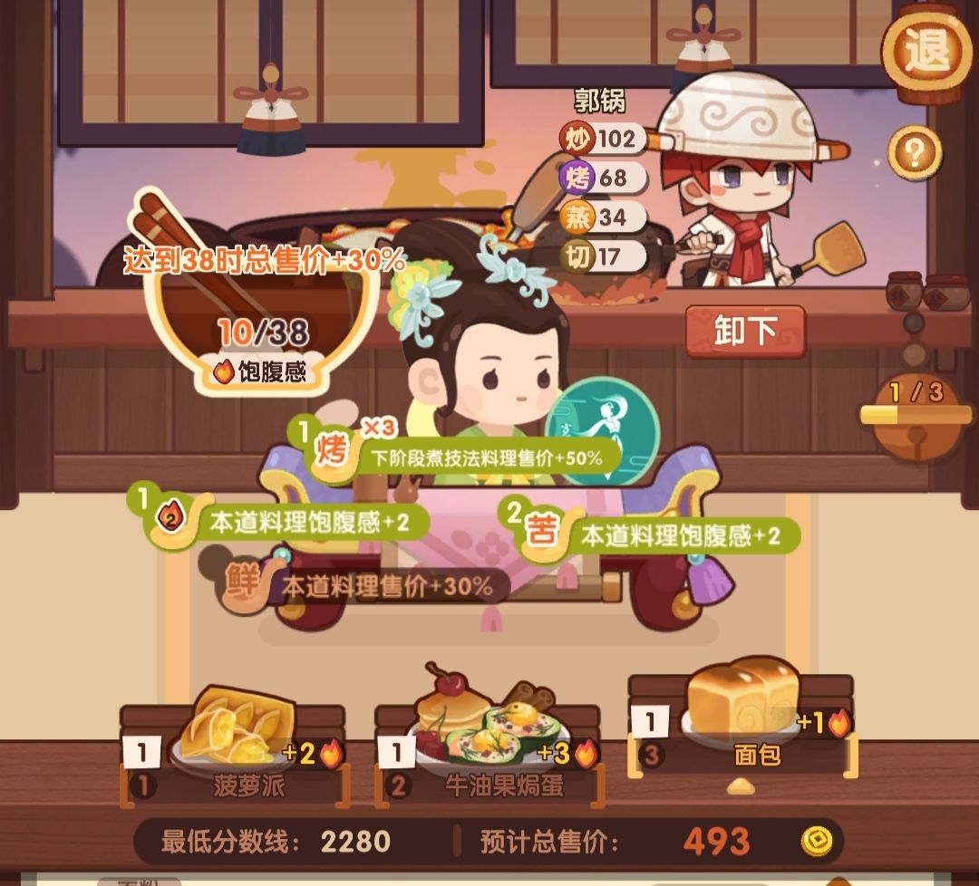 何仙姑饱食度给的很大方,第一轮就能满档。核心就是第一个角色做3炒菜。舒婷下位替代小皇帝(30%售价),贝多分(单人做菜强,不过后续走二郎神路线可能没高分炒切菜来吃贝多分buff) 今天想起来胡喜媚还没做,之前看到3🔥切酸,下意识用悲歌做荔枝虾球吃双倍buff,然后饱食度不够用,第一个厨做不了5🔥吃100%售价,最后得分在160w左右。可以在第二道菜用4🔥,宝山飞龙锅-6饱食度。[表情_捂脸哭]当然