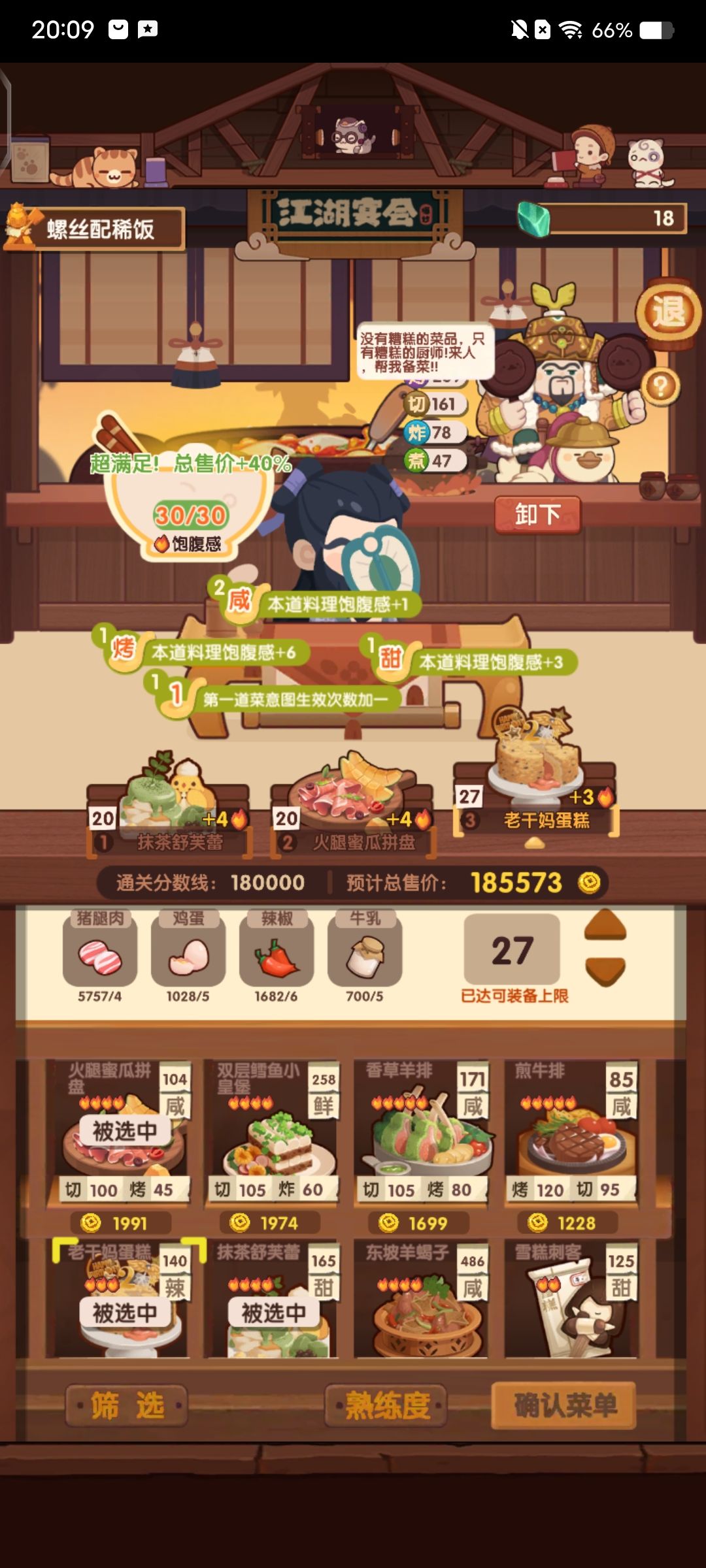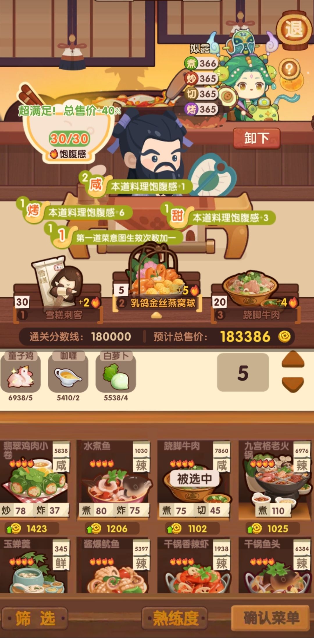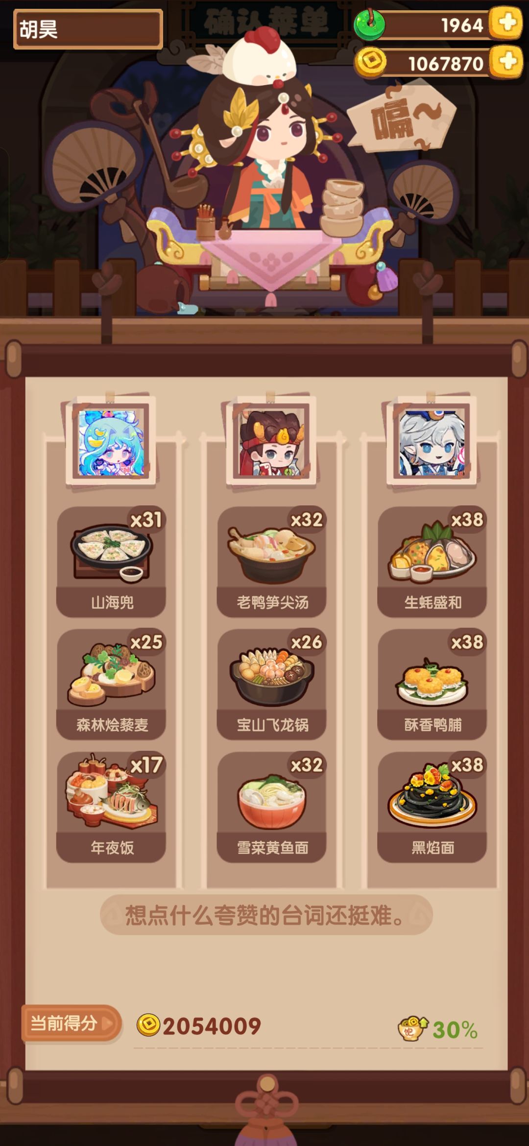 何仙姑饱食度给的很大方,第一轮就能满档。核心就是第一个角色做3炒菜。舒婷下位替代小皇帝(30%售价),贝多分(单人做菜强,不过后续走二郎神路线可能没高分炒切菜来吃贝多分buff) 今天想起来胡喜媚还没做,之前看到3🔥切酸,下意识用悲歌做荔枝虾球吃双倍buff,然后饱食度不够用,第一个厨做不了5🔥吃100%售价,最后得分在160w左右。可以在第二道菜用4🔥,宝山飞龙锅-6饱食度。[表情_捂脸哭]当然