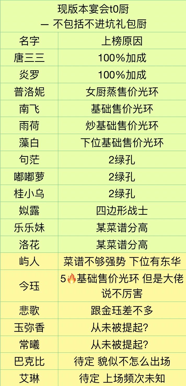 现版本宴会t0厨探讨-零氪版