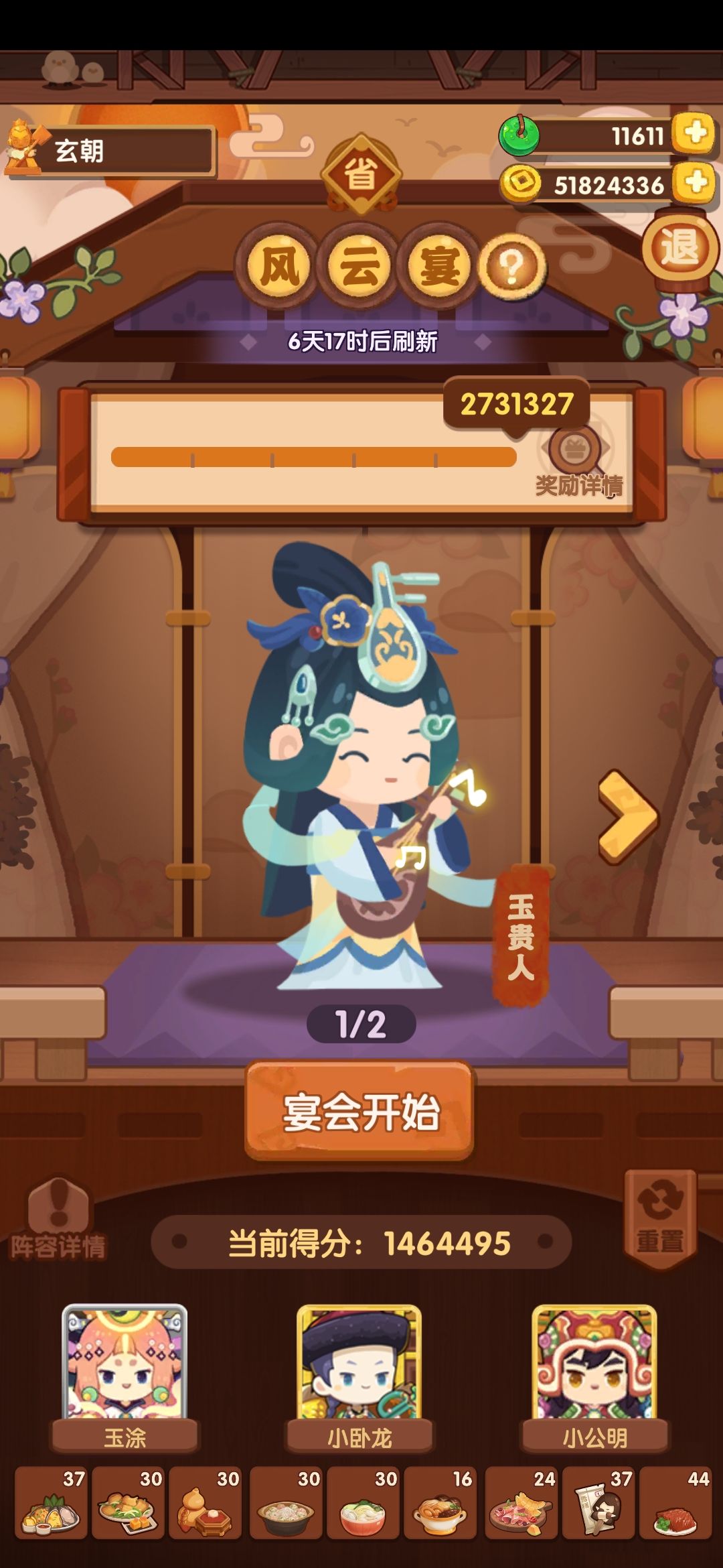 双贵客都可达成单人拿满奖励(>216万) 打更人由于炎罗这个顶分选手,相对来讲比较好拿满档,p3的乐乐妹换二郎神能更高(>250万)。不过没二郎神,在玉贵人很难达成单人>216。于是让二郎神去下一关发光发热。。舒婷这个厨具单纯强迫症犯了,想要神鸡头米 玉贵人试过悲歌,阿狸走切炸流,但是一顿操作下来最高也就不到200万。二郎神一开始也是习惯性切炸,毕竟13饱食度要求卡的很严格。emmm不过实在舍不得