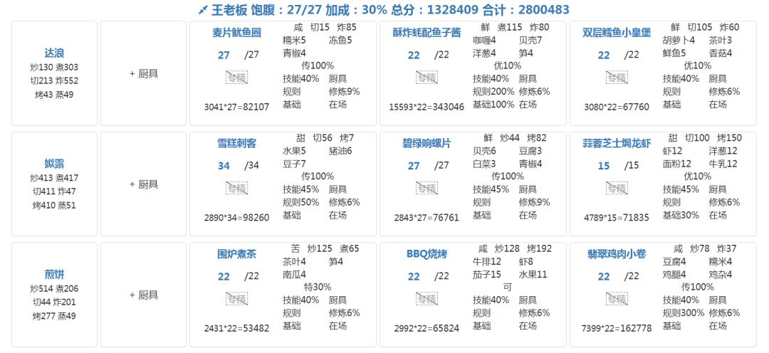 国际惯例的全员无厨具、无遗玉、无礼包厨(坑除外),修炼接近无氪满修炼,具体数值在下方,东西在评论区里。 全员有修炼,黑柏修炼不影响结果。 全菜谱无专精,五火菜谱上限17适用,上限17总分3476731,上限18总分3501925,上限19总分3527119,上限20总分3552314,上限21总分3577507。 因本期宴会贵客是所有宴会贵客里有着最高满档分数线,修炼不足的会有【拥有艾琳和阿狸两个