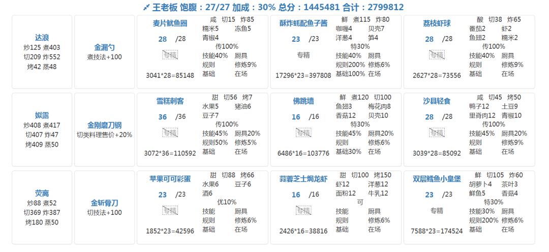 很久没交过作业了,今天交一下 菜和厨师基本都是最近的池,麦田姬可能可以用橙风替一下 关于两个后厨菜,全套菜饭可以用老鸭笋尖汤替一下,荷香月色可以用朝露新晨、豪华海鲜桶等替代,实在没有这些就用新池的青柠金汤翅捞饭替吧,大不了上厨具 另外炒鳝糊换成冬阴功汤,分会更高(我懒得再交一次了),也可以换成低配雪景球蛋糕 厨具: 玫玫君:豪华蒸笼 蒸技法+100(之前泡实验室换的) 姒露:豪华甜品架 切价格+3