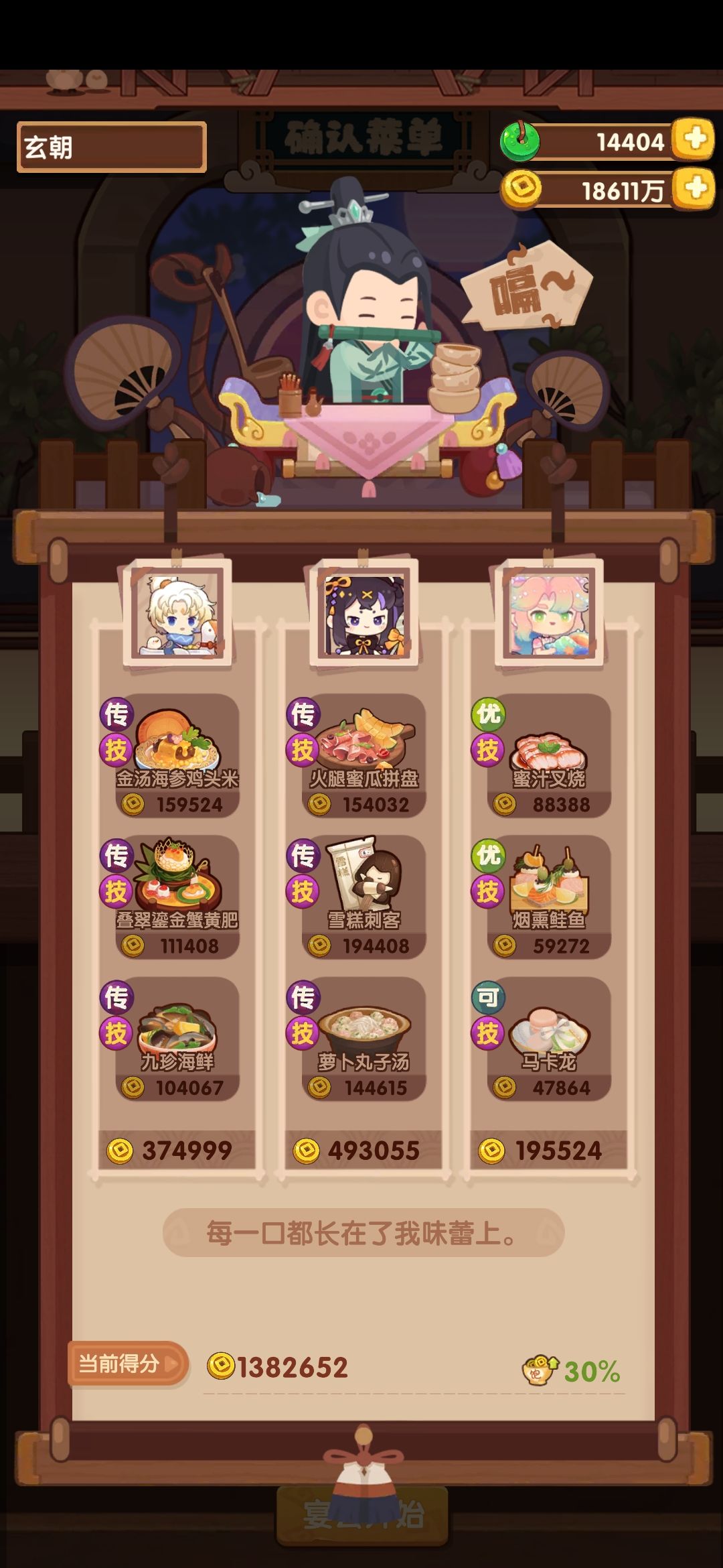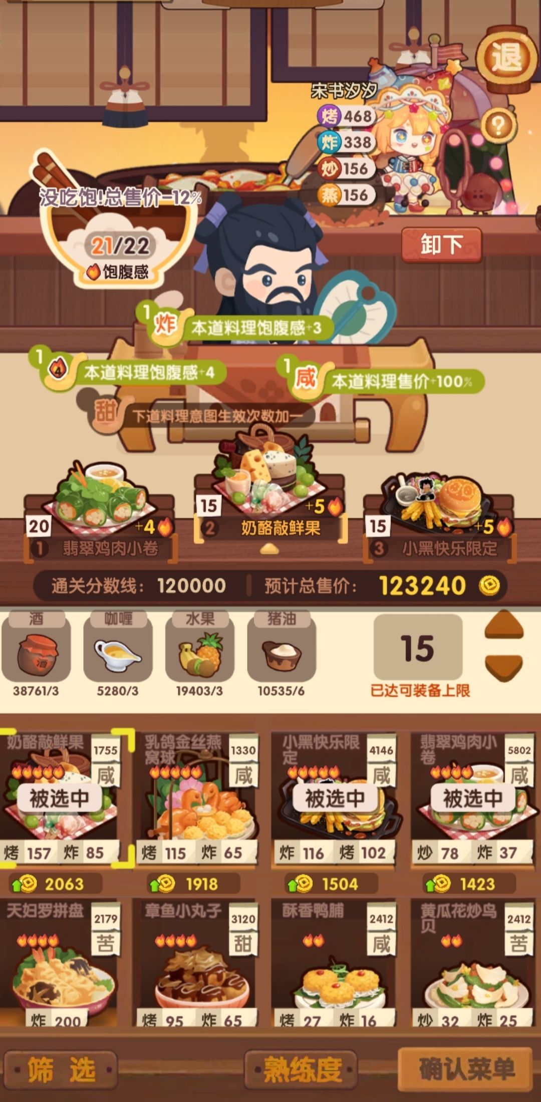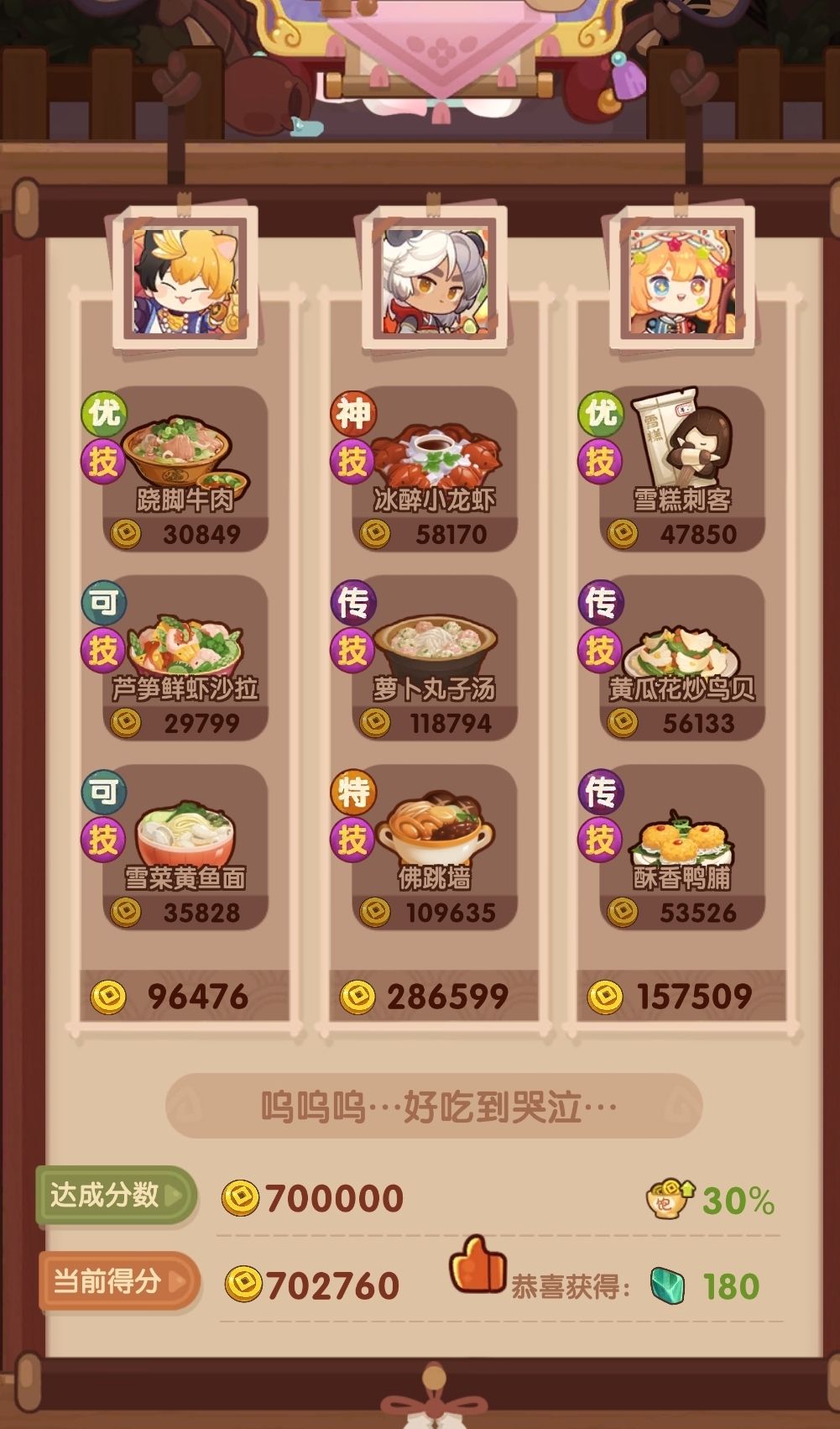 思路是煮切蒸选自己有的能拿高分的两个技法菜堆,我最高就是佛跳墙,而且煮切菜比较多且都较高分,所以选择走煮切系,要是有别的也可以选。 嗯,可以更高分,这是我试出来的过线最低配😂 这次上菜顺序很重要,有几个菜卡死位置