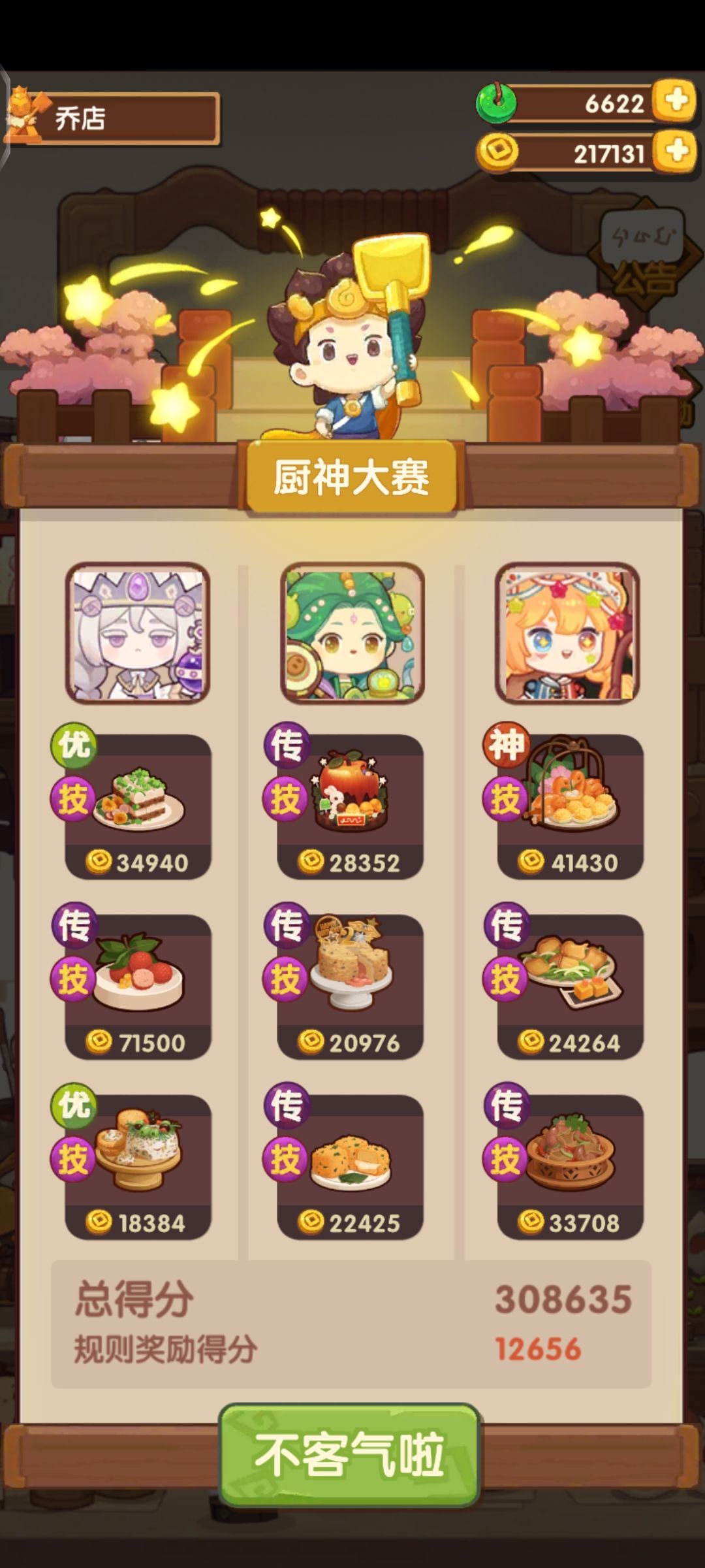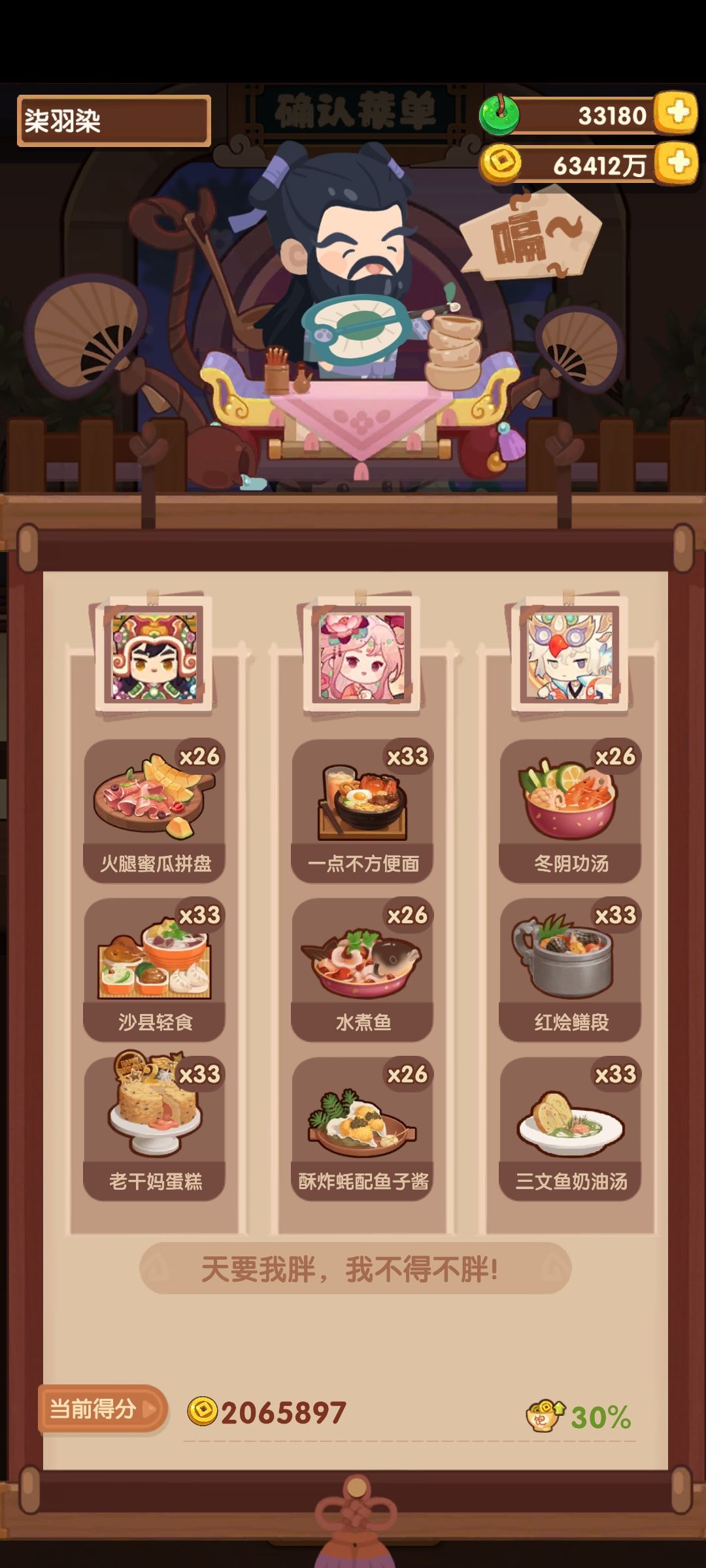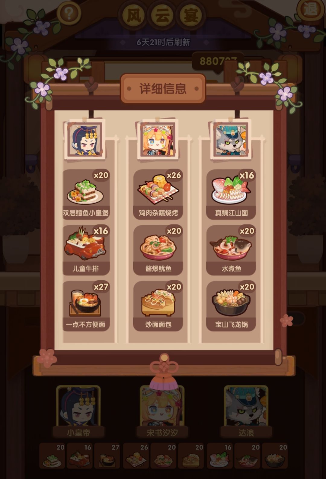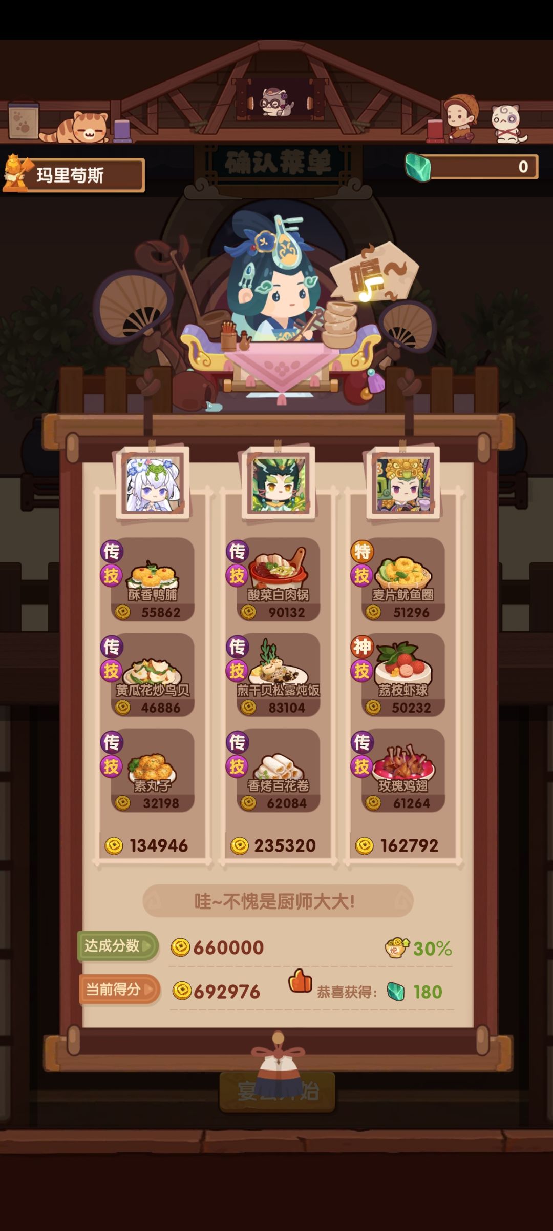思路是煮切蒸选自己有的能拿高分的两个技法菜堆,我最高就是佛跳墙,而且煮切菜比较多且都较高分,所以选择走煮切系,要是有别的也可以选。 嗯,可以更高分,这是我试出来的过线最低配😂 这次上菜顺序很重要,有几个菜卡死位置