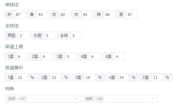 这周是韩湘子和钟离权,真难啊韩湘子,品级高了还加饱食度,回归老玩家前几个池都没抽过,高分菜的池几乎都没有抽,也是心累。 算了半天,加上各种已有的厨具和遗玉,才在理论的情况下,很极限去专精菜才可能满5档,非常菜的回归老玩家一枚。可能不一定有参考价值。 为了不浪费,都是用的2火的厨具,方便之后可能还要碎,上周为了过线就碎了个小卧龙的3火的圣光烤叉,亏大了,包里就剩一个了先留着吧 不过,今天终于学会了怎