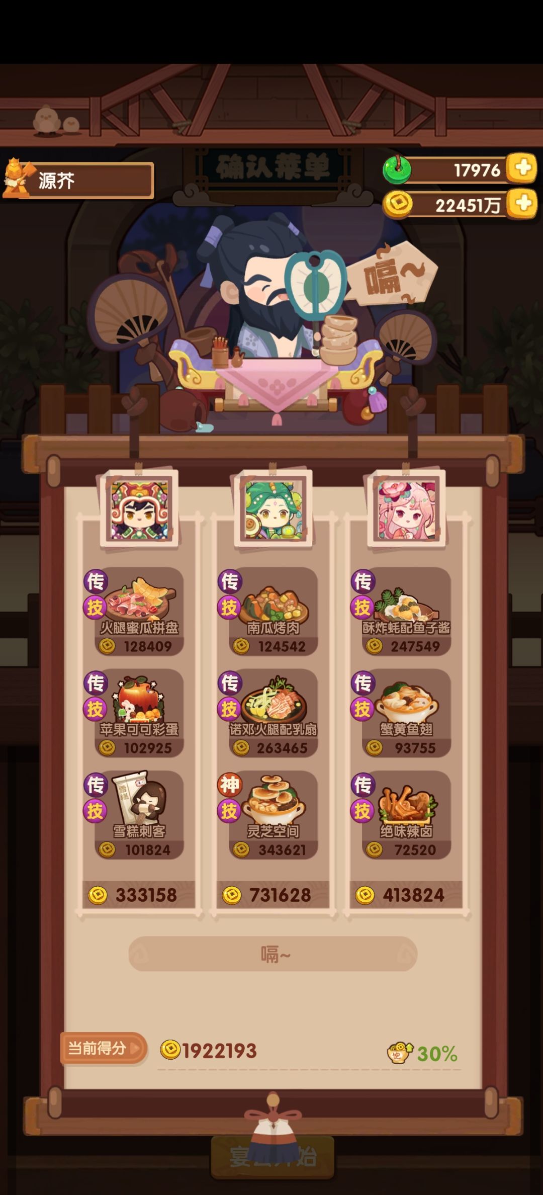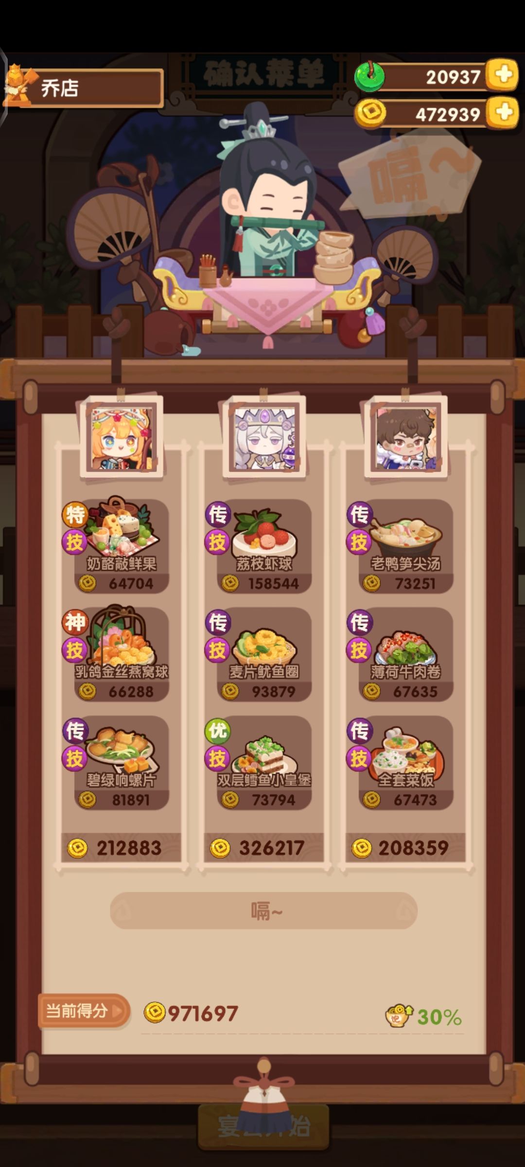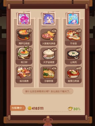 宴会极限擦边,适合无后厨菜的,作业里没有生蚝、年夜饭、BBQ、雪笋干贝,但是需要上厨具,作业里小公明有躺平鸭杯,其他有的会是一二星厨具,如果有以上几个菜,就很容易达标