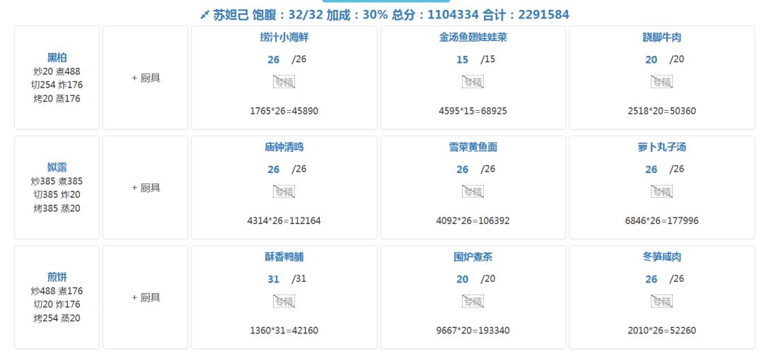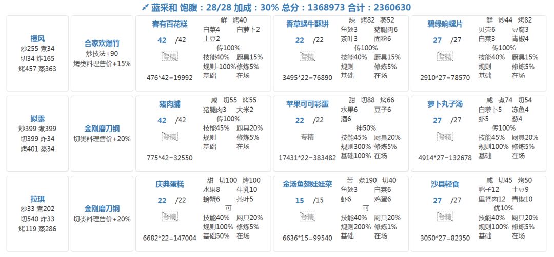 国际惯例的全员无厨具,修炼偏高,具体数值在P3。 句茫、气仙人、尤伶有修炼。 在修炼足够的情况下,红蟳米糕可换蒸汽石锅鱼,沙嗲拼盘可换风味塔可。 没替换且全无专精的情况下总分2884862,替换了且全无专精的情况下总分2714107。 有虹兔糖建议把宋书汐汐换成虹兔糖,第二道菜换蒜蓉芝士焗龙虾,分数会更高。
